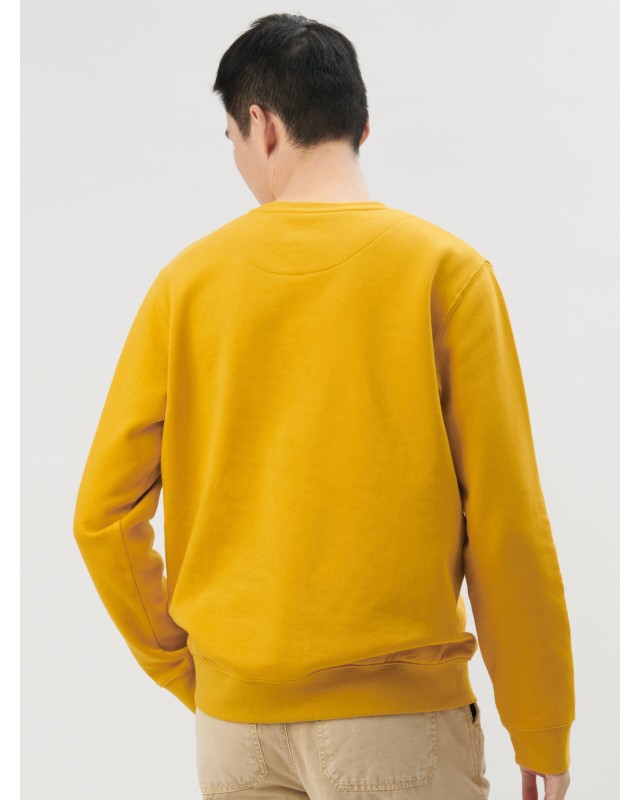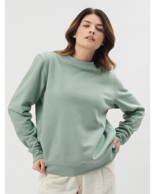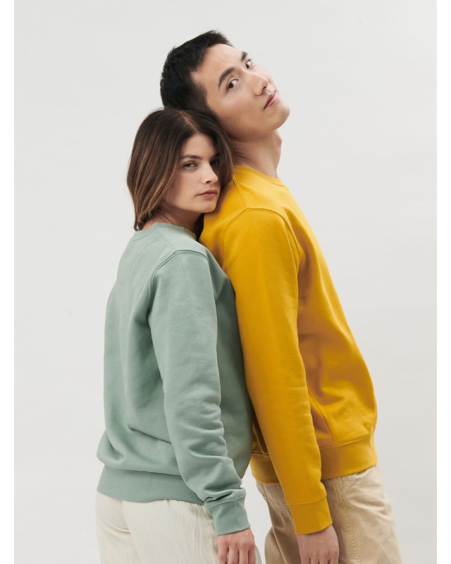 80% cotone organico, 20% poliestere riclicato. Felpa girocollo, felpata internamente, maniche set-in. Collo, polsini e orlo inferiore in costina, rinforzo sul colletto, struttura con cuciture laterali. Etichetta strappabile. Tessuto PST: interno in poliestere ed esterno 100% cotone.
