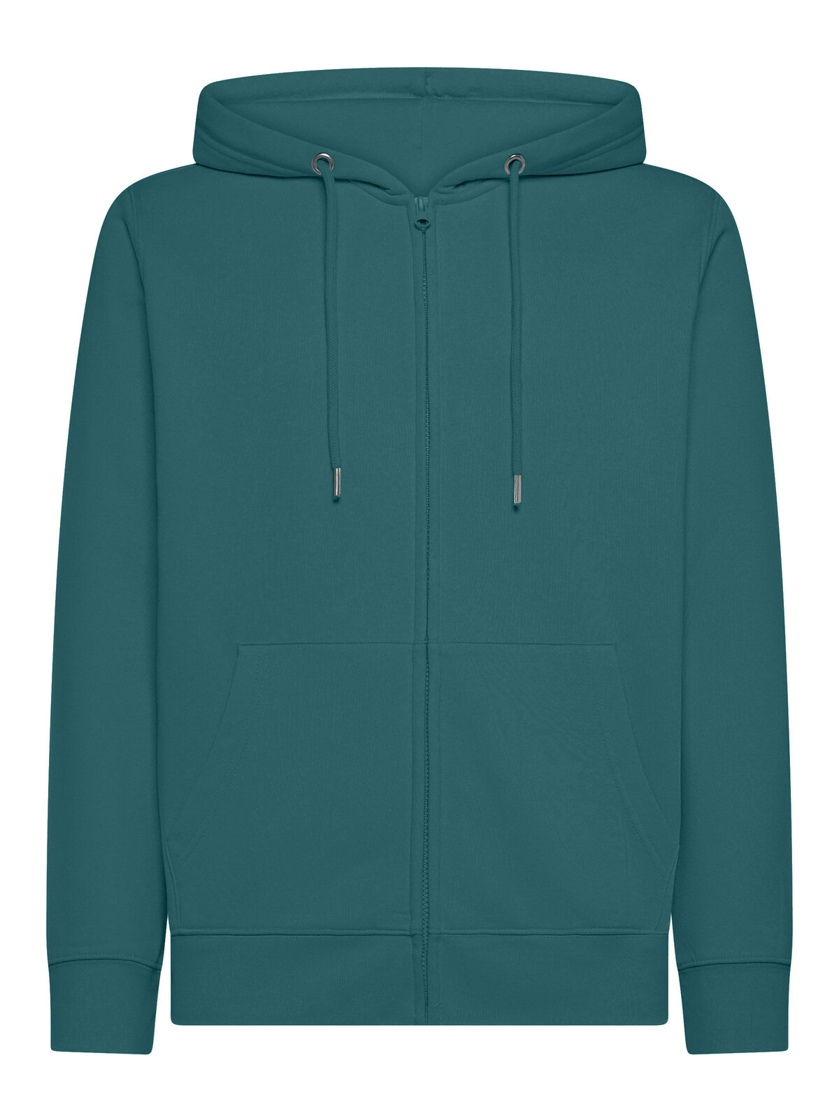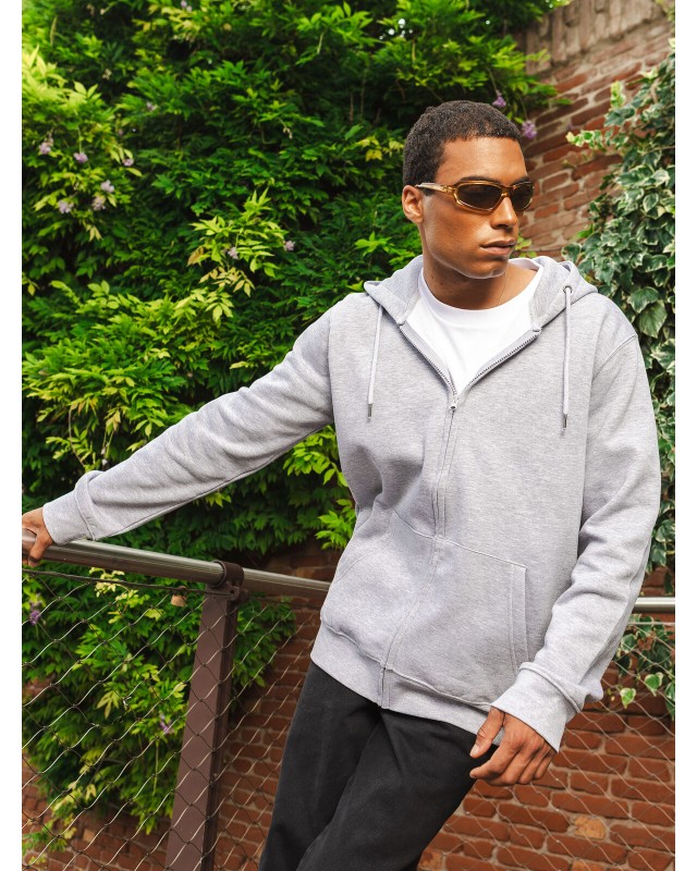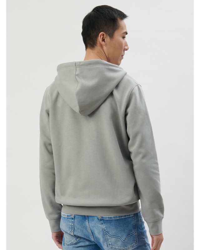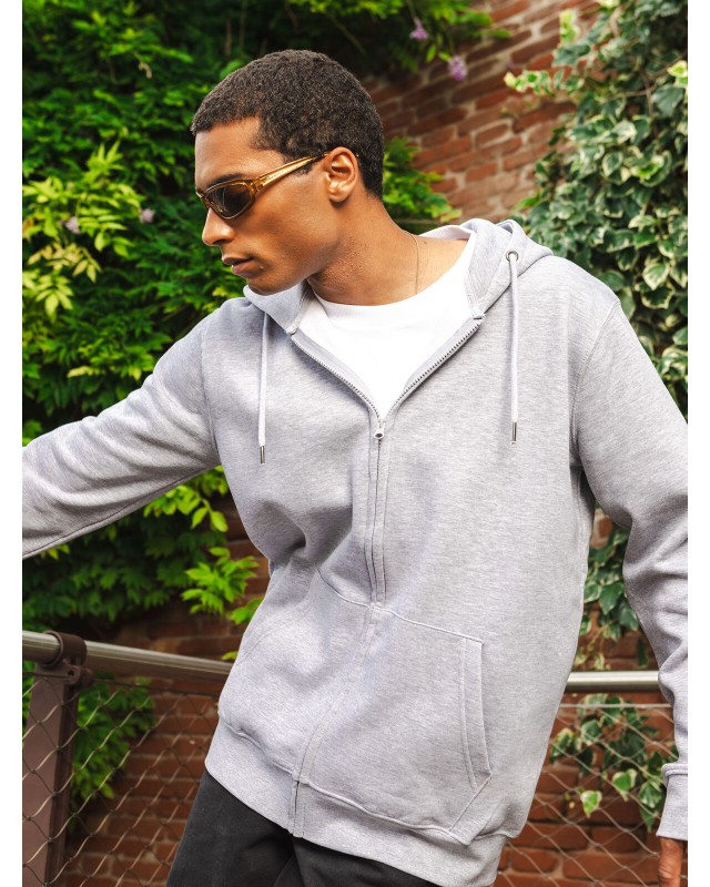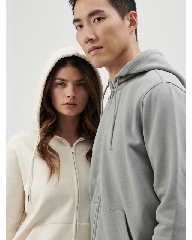 80% cotone organico, 20% poliestere riclicato. Felpa con cappuccio a doppio strato, felpata internamente, maniche set-in, cerniera tono su tono coperta, occhielli in metallo, cordini con punta in metallo, tasca a marsupio, orlo inferiore e polsini in costina, struttura con cuciture laterali. Tessuto PST: interno in poliestere ed esterno 100% cotone. Etichetta strappabile.