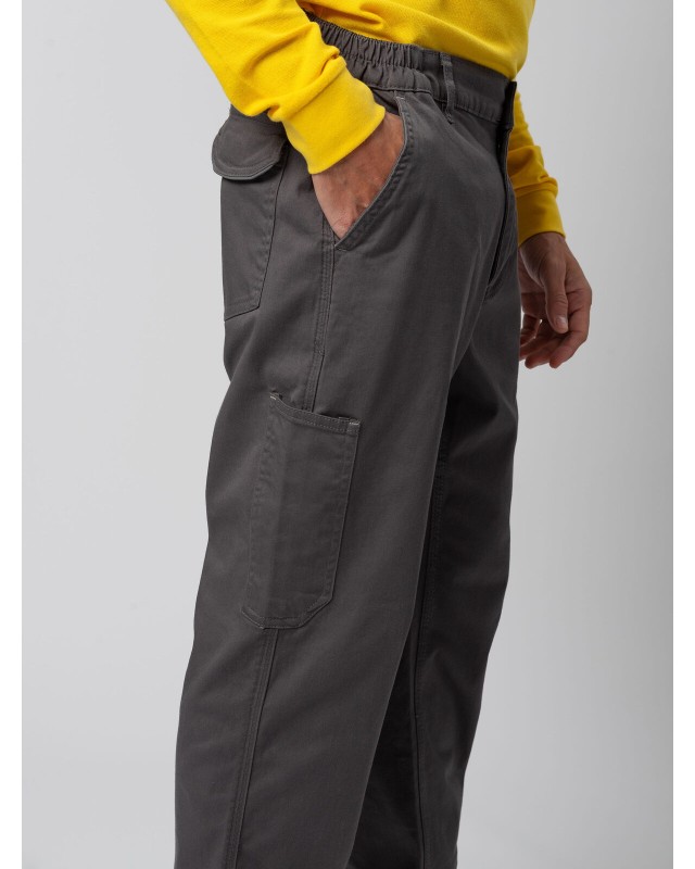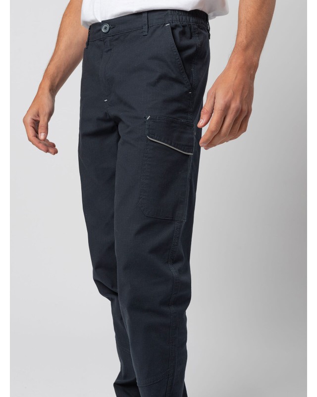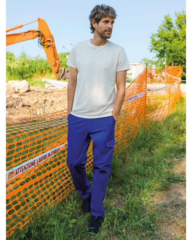 98% cotone, 2% elastane. Pantalone multitasche elasticizzato, tessuto prelavato, due tasche anteriori, una tasca laterale con Velcro, una tasca porta metro e portautensili, una tasca posteriore con Velcro. Inserto HiViz nel fianco e nel retro. Due cuciture anteriori sotto il ginocchio, elastici in vita e passanti maggiorati. Etichetta strappabile.