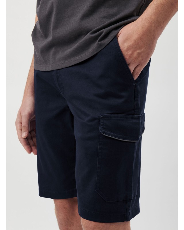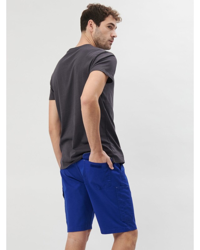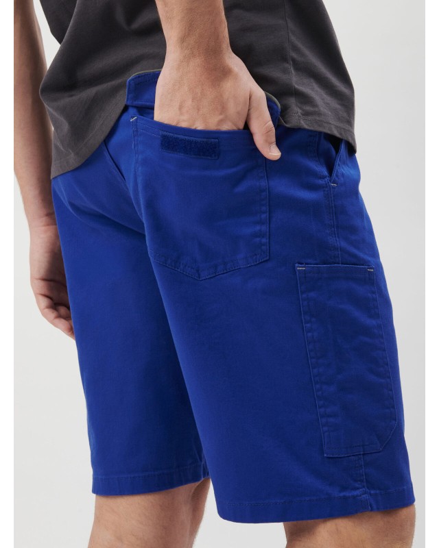 98% cotone, 2% elastane. Pantalone corto multitasche elasticizzato, tessuto prelavato, due tasche anteriori, una tasca laterale con Velcro, una tasca porta metro e portautensili, una tasca posteriore con Velcro. Inserto HiViz nel fianco e nel retro. Due cuciture anteriori sotto il ginocchio, elastici in vita e passanti maggiorati. Etichetta strappabile.