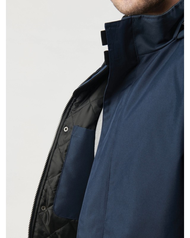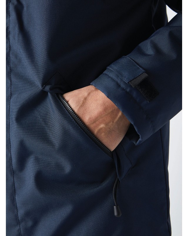 100% poliestere. Parka full zip con doppio cursore e patta di chiusura con Velcro® e bottoni a pressione. Cappuccio a scomparsa nel collo regolabile con coulisse. Interno del collo foderato in pile. Antivento. Due tasche esterne con zip e patta, una tasca interna. Polsini regolabili mediante chiusura in velcro. Zip interna per facilitare la personalizzazione sulla schiena. Etichetta strappabile.