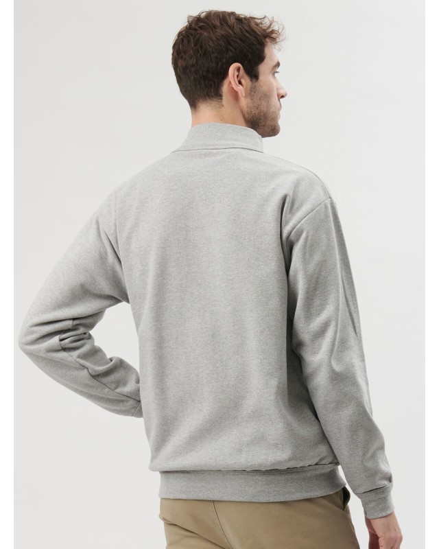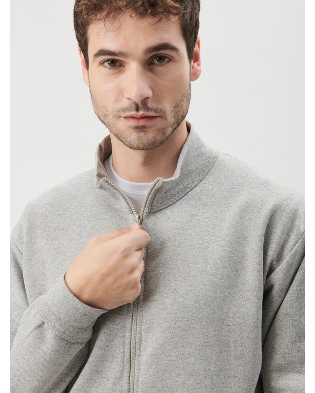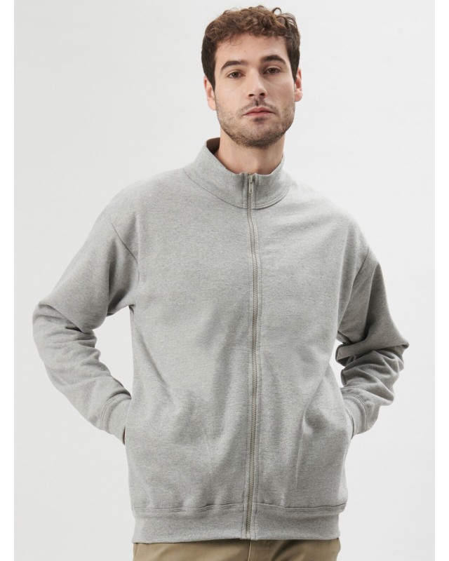 65% cotone riciclato, 35% poliestere riciclato. Felpa full zip in tessuto di cotone e poliestere riciclati, manica dritta, felpata internamente. Produzione interamente italiana. Cerniera in plastica, tirazip in metallo. Cuciture laterali. Etichetta strappabile.