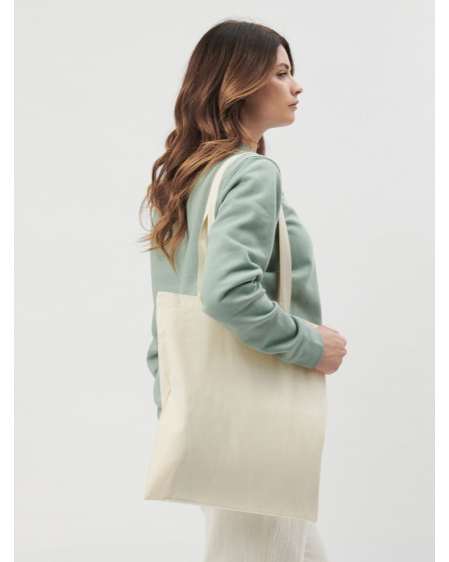 100% cotone organico. Shopper organica con manico lungo 67 cm, prodotto stirato per una migliore stampabilità. Etichetta removibile. Dimensione: 38 x 42 cm. Area stampabile: 26 x 30 cm.