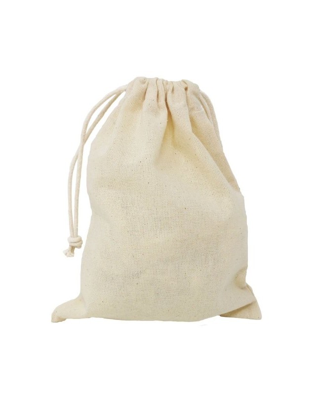 100% cotone organico. Sacchetti con cordino doppio in colore naturale. Dimensioni: XS: 10x15 c, cap. 0,25 lt. - S: 15x20 cm, cap. 1 lt. - M: 25x30 cm, cap. 3 lt. - L: 30x40 cm, cap. 7 lt.