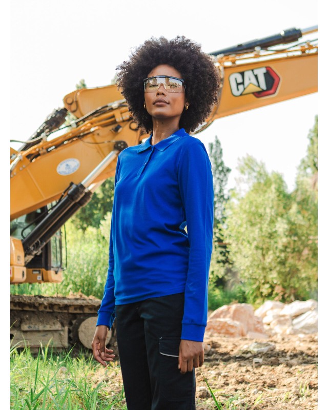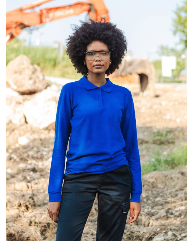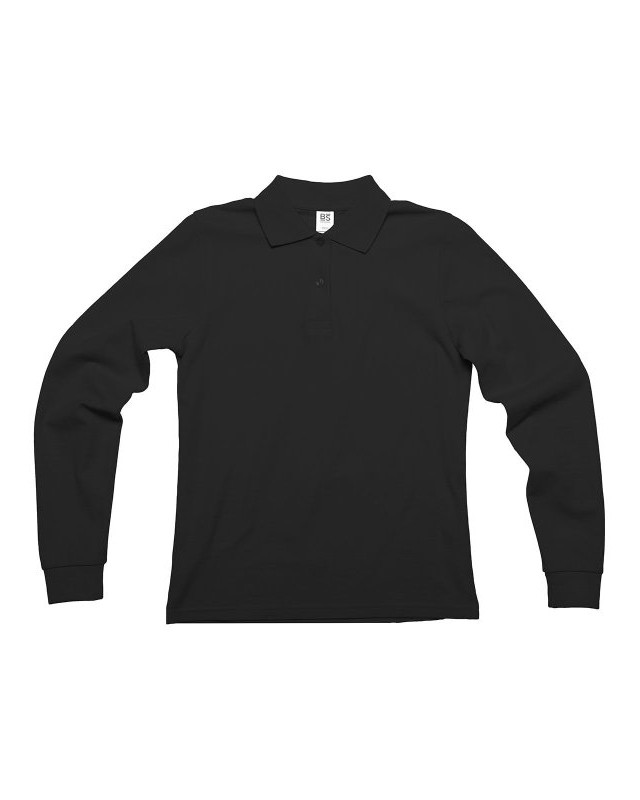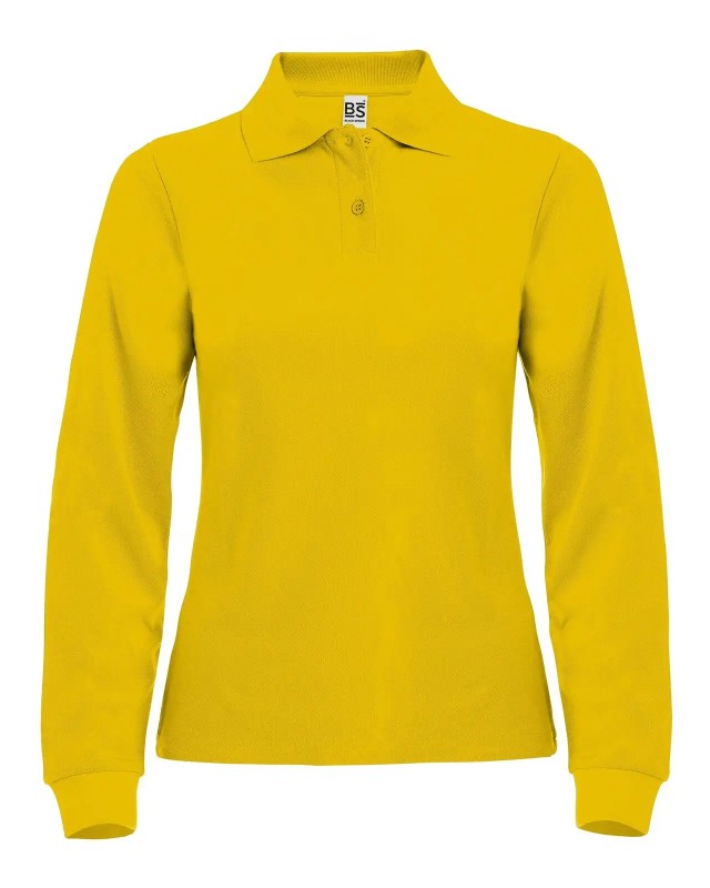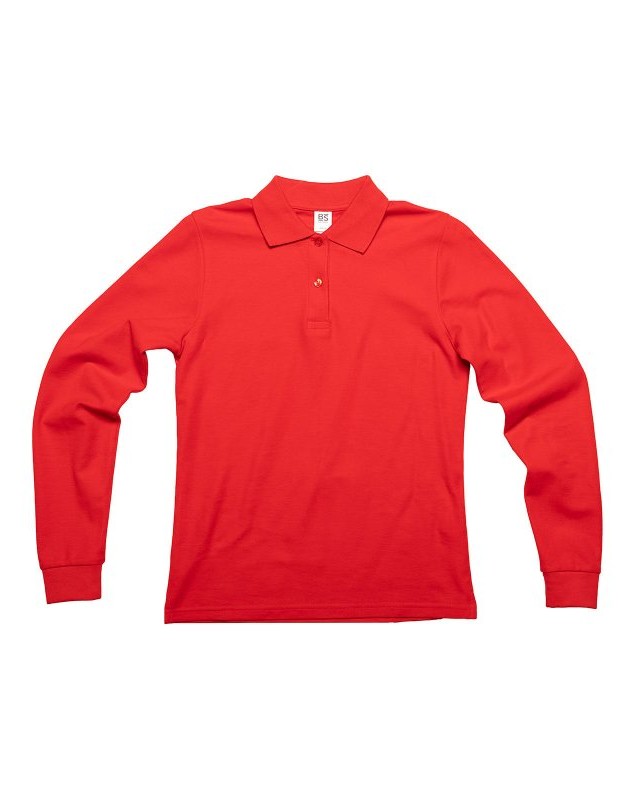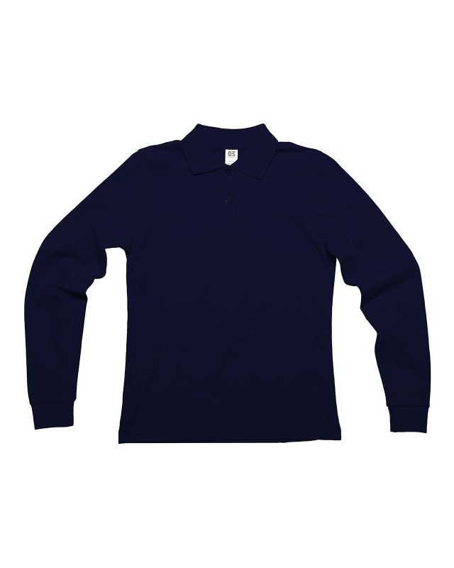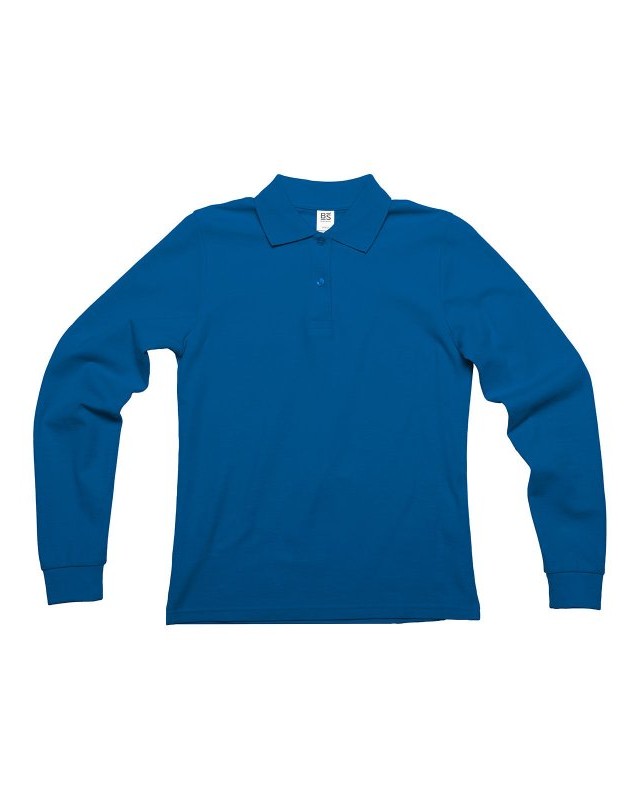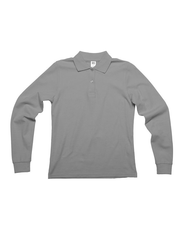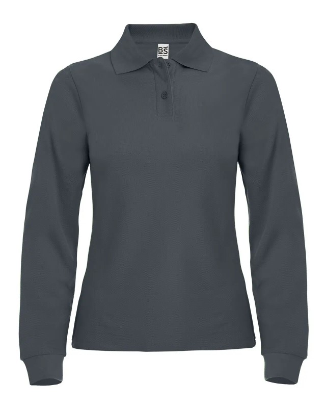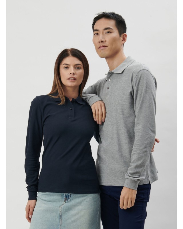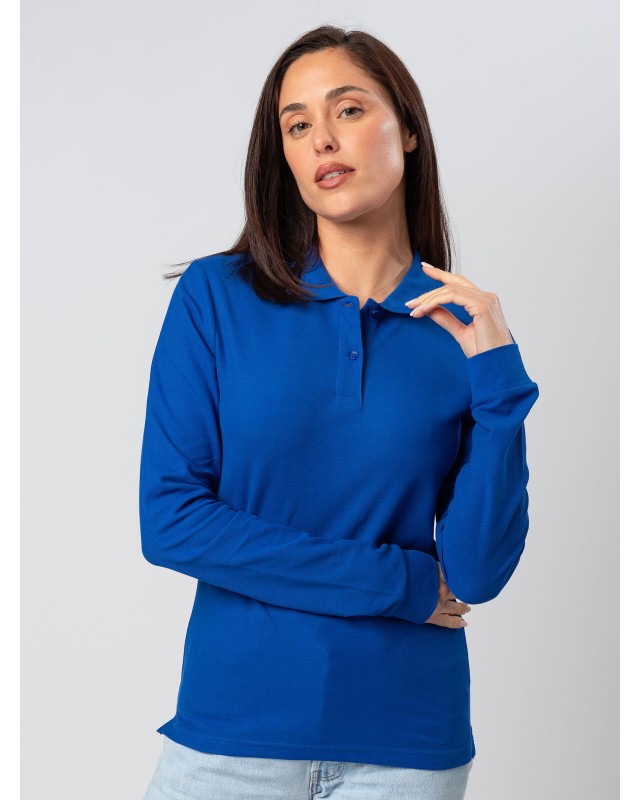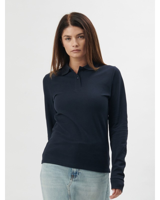 100% cotone piqué. Polo donna a maniche lunghe set-in con costine, 2 bottoni tono su tono, nastro di rinforzo al collo, struttura con cuciture e spacchetti laterali.