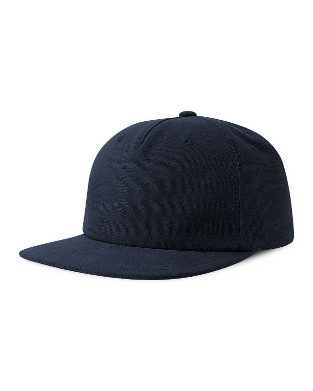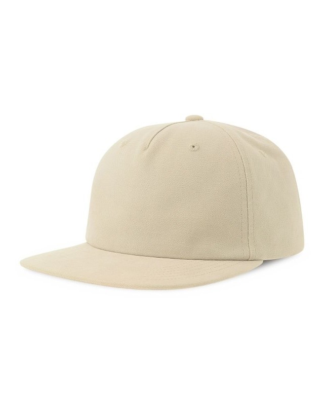 100% cotone canvas organico. Cappello a 5 pannelli in cotone organico e riciclato, con visiera piatta e chiusura snapback in pvc, etichetta removibile.