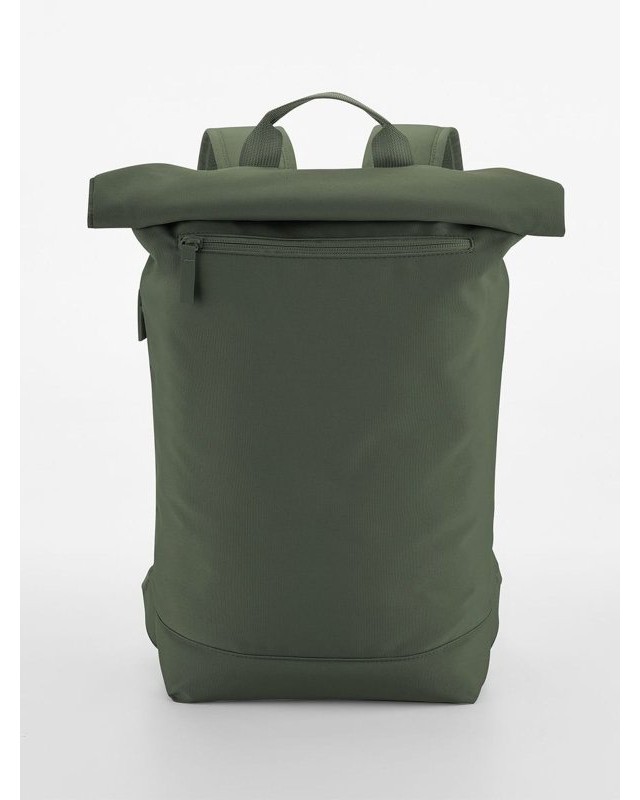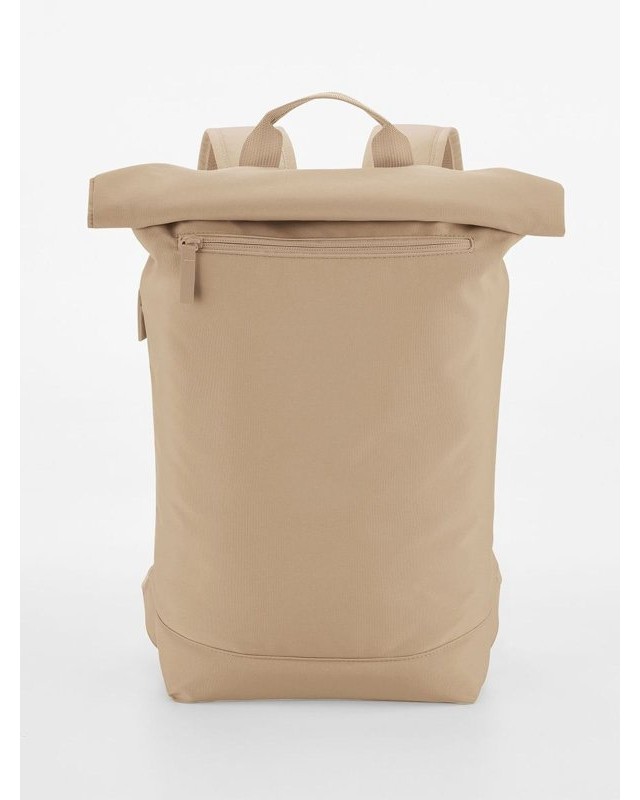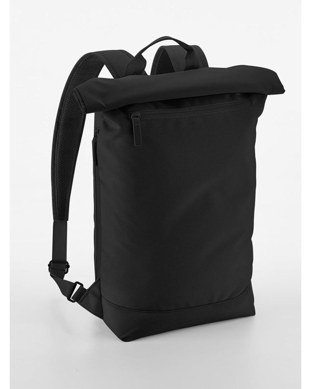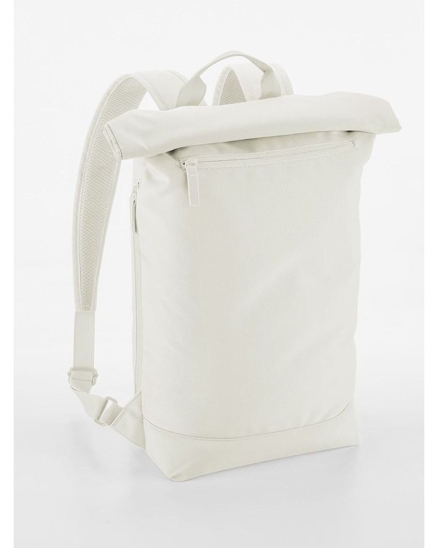 100% poliestere riciclato. Zaino per laptop fino a 11'', chiusura magnetica roll-top, rivestimento idrorepellente, tasca esterna per bottiglia, tasca laterale con zip per ombrello, zip frontale esterna per facilitare la personalizzazione, taschino interno, schienale in rete imbottito, cinghia posteriore per i bagagli, spallacci in rete imbottiti e regolabili. Dimensioni: 43x34x11cm, Capacità: 12 litri, Area stampabile: 27x27cm massimo. Etichetta strappabile.
