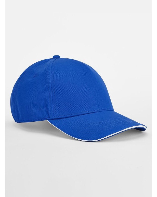 100% cotone organico. Cappellino a 5 pannelli in cotone organico Twill certificato OCS, visiera sandwich di colore contrastante, occhielli di ventilazione cuciti, chiusura con fibbia tri-glide. Taglia unica. Etichetta strappabile.