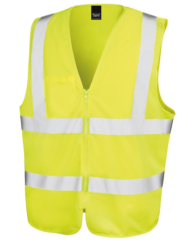 100% poliestere. Gilet ad ampia vestibilità con zip. Fasce riflettenti sul corpo e sulle spalle. Tasca sul petto per pannello ID (95 x 60mm). Adatto alla stampa su unico strato per transfert, stampa diretta o ricamo. EN ISO 20471 + A1:2016 class 2.