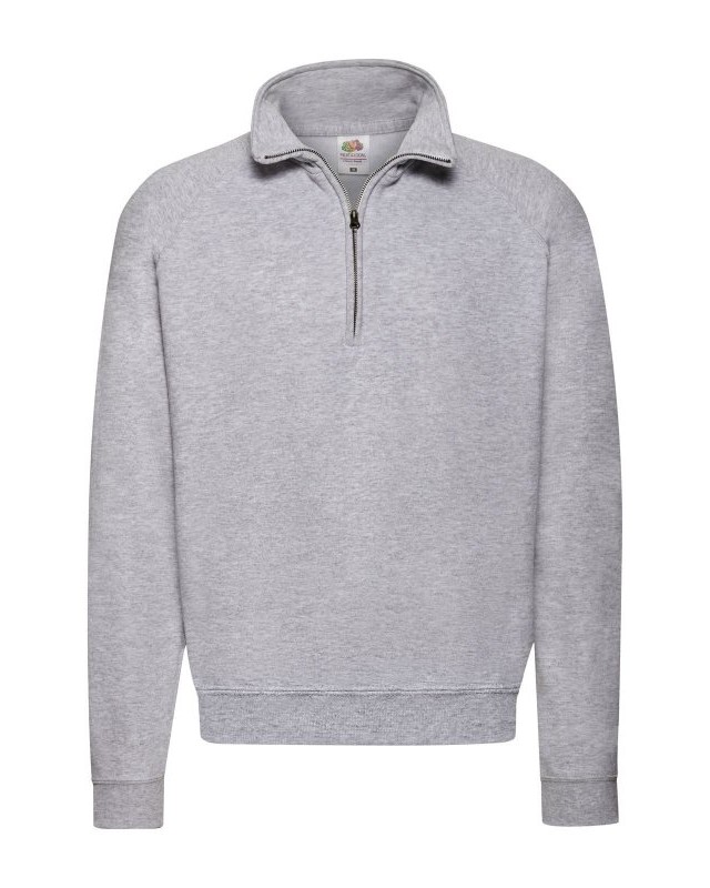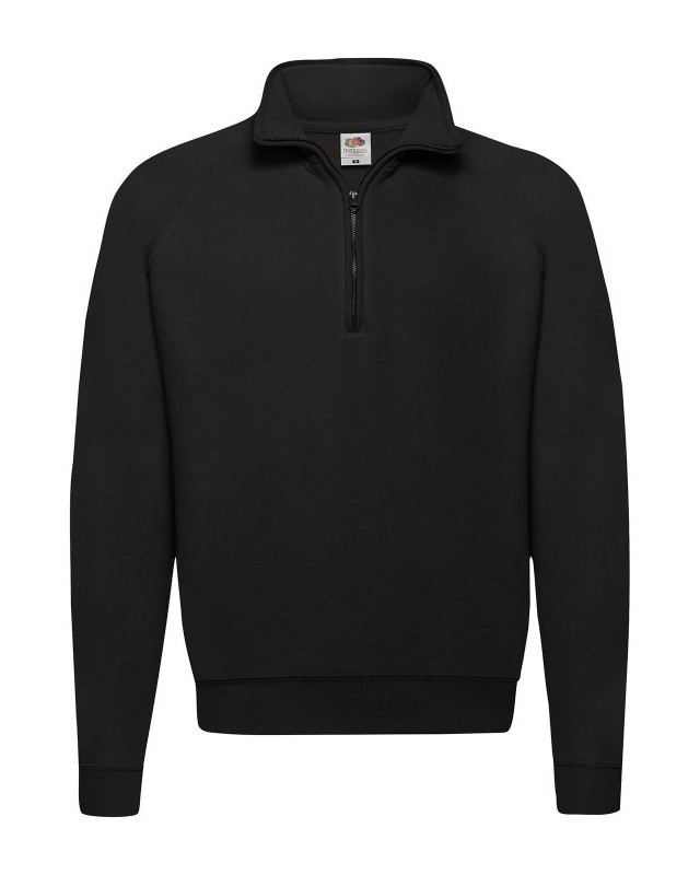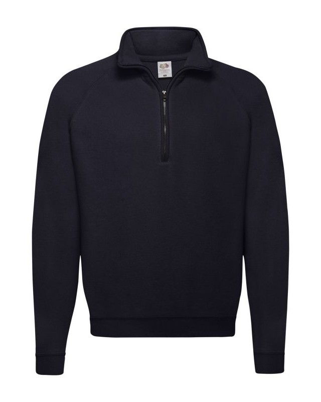 80% cotone, 20% poliestere. Felpa con maniche raglan, zip ¼ con tiralampo, felpata internamente, struttura con cuciture laterali. Etichetta removibile.