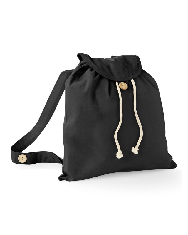 100% cotone organico, certificato Control Union. Zainetto con chiusura principale con cordoncino in tinta e bottone in legno. Etichetta removibile.