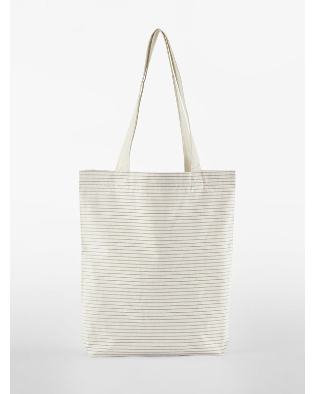 100% cotone organico. Shopper a righe in cotone organico certificato GOTS - CU811033, può essere portata a mano o in spalla. Etichetta removibile. Lunghezza manici: 67 cm. Dimensioni: 29x42x8 cm, capacità: 10 litri, area stampabile: 27x36 cm.