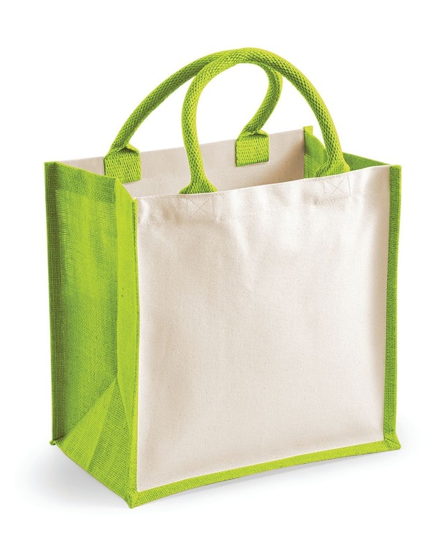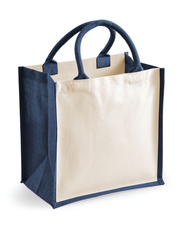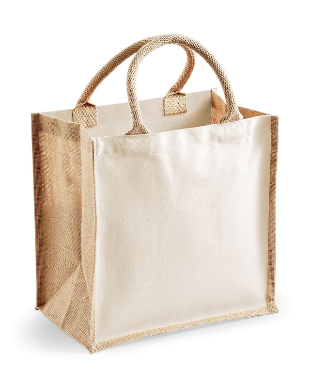 100% Juta laminata e cotone canvas. Shopper con pannelli laterali. Etichetta removibile. Lunghezza manici: 40 cm, dimensioni: 30 x 30 x 19 cm, capacita': 14 litri, area stamapabile: 24 x 22 cm.