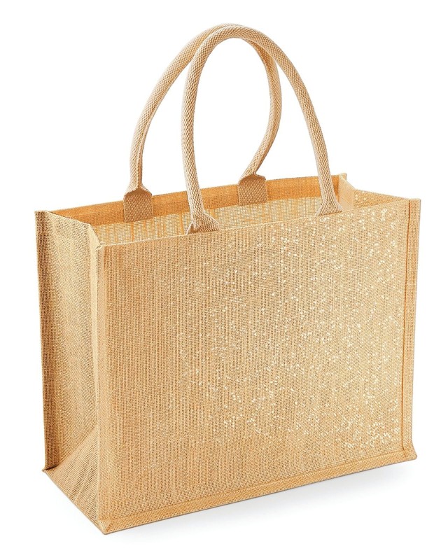 98% Iuta laminata 2% Fibra metallizzata. Shopper con manici in cotone (lunghezza: 55 cm), dimensioni: 42 x 33 x 19 cm, capacita': 21 litri, area stampabile: 34 x 24 cm. Etichetta removibile.