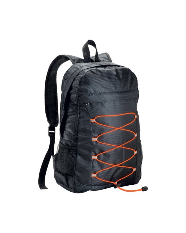 Zaino ripiegabile in poliestere RIPSTOP con 4 tasche di cui 2 laterali retinate ed elastici frontali Materiale: Polyester Dimensioni: 43 X 29 X 11,5CM - 14 LT