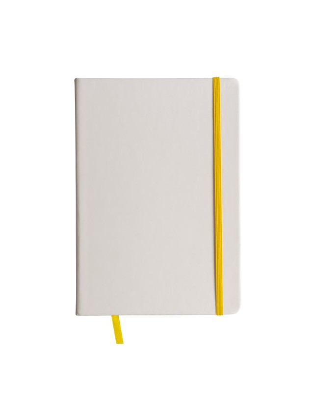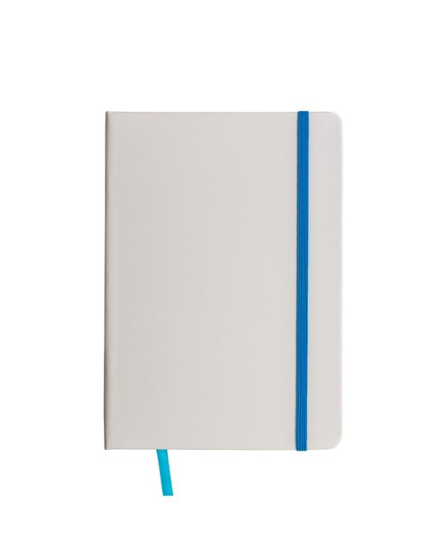 Quaderno in copertina in PU con elastico colorato, fogli bianchi a righe (80 pag.), segnalibro in raso Dimensioni: 15 X 21 CM