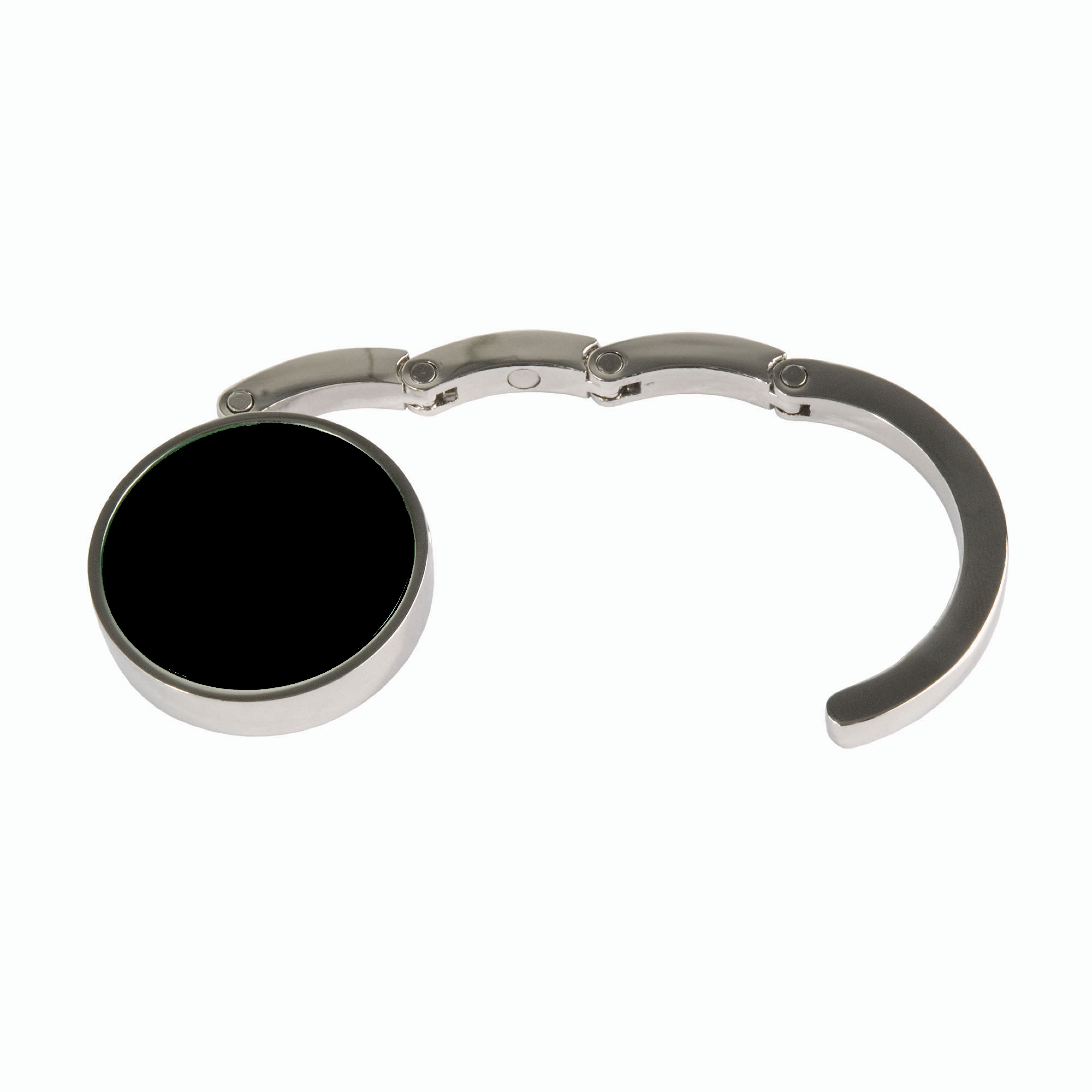 Gancio appendiborsa tondo in metallo, richiudibile con chiusura rafforzata da due magneti, confezionato in scatoletta nera singola Materiale: Metal Dimensioni: 4,5 CM