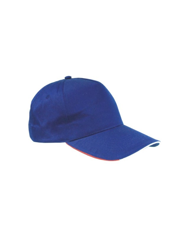 Cappellino in cotone, 5 pannelli con visiera sandwich tricolore e ricamo tricolore sulla regolazione a velcro) Materiale: Cotton Dimensioni: ONE SIZE ADULT Grammatura: 160 GSM/M2