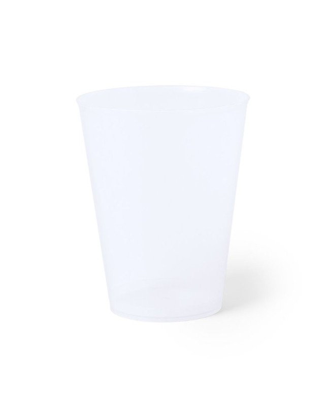 Vetro da 500 ml in materiale PP resistente e flessibile. Riutilizzabile e con finitura traslucida. - Diametro: 9.2 cm - Peso: 21 gr