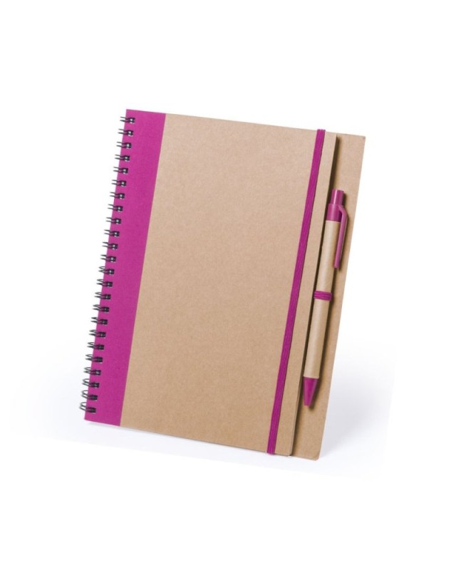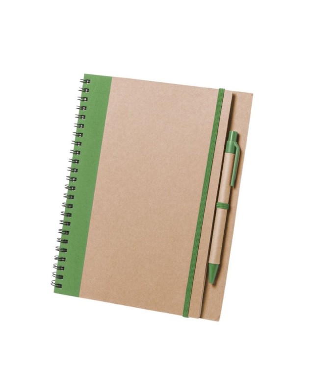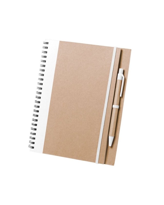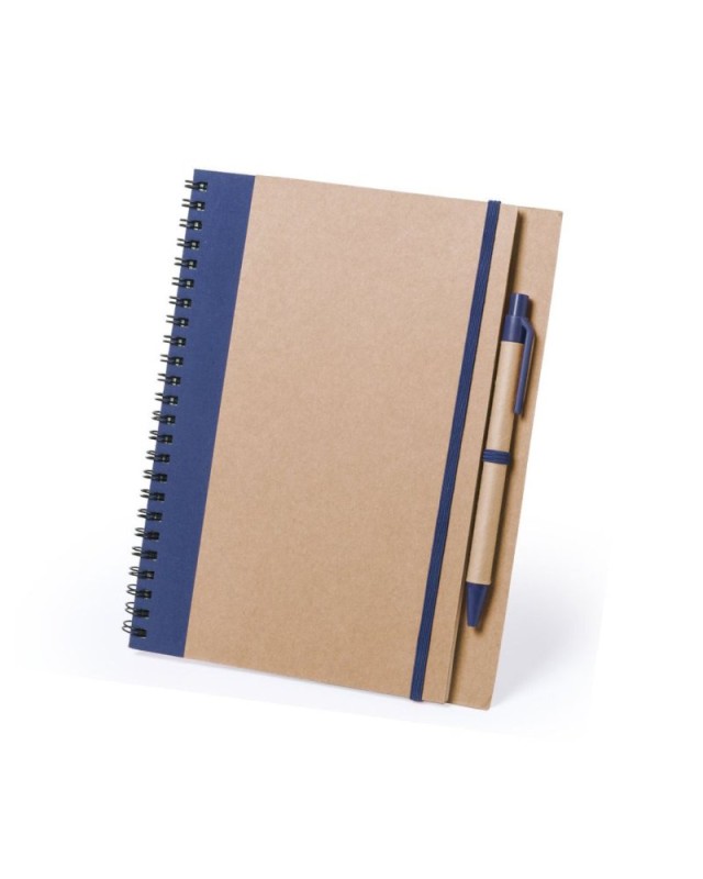 Taccuino ad anelli con copertina soft touch in robusto cartone riciclato bicolore, chiusura elastica sulla copertina e penna in cartone riciclato abbinata. Colori vivaci, 60 pagine lisce e portapenne sul retro della copertina. - Lunghezza: 16.5 cm - Larghezza: 1 cm - Peso: 175 gr