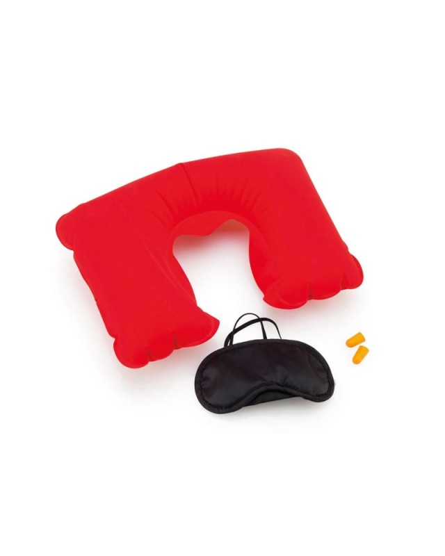 Set da viaggio di 3 accessori presentati in un morbido astuccio in pelle scamosciata dai colori vivaci. Include maschera in morbida e confortevole microfibra nera con doppio cinturino elastico abbinato, cuscino gonfiabile per il collo in pelle scamosciata e tappi per le orecchie in comodo materiale EVA arancione. - Lunghezza: 17.5 cm - Peso: 75 gr