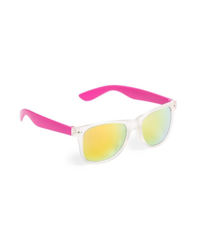 Occhiali da sole con protezione UV400 dal design classico. Con montatura con finitura traslucida, aste dai colori divertenti e lenti specchiate abbinate. - Peso: 26 gr