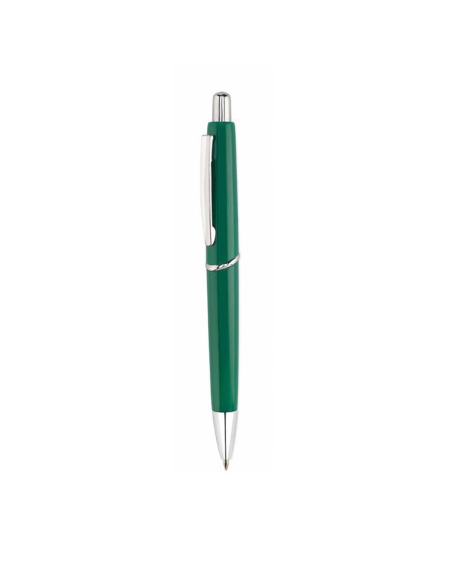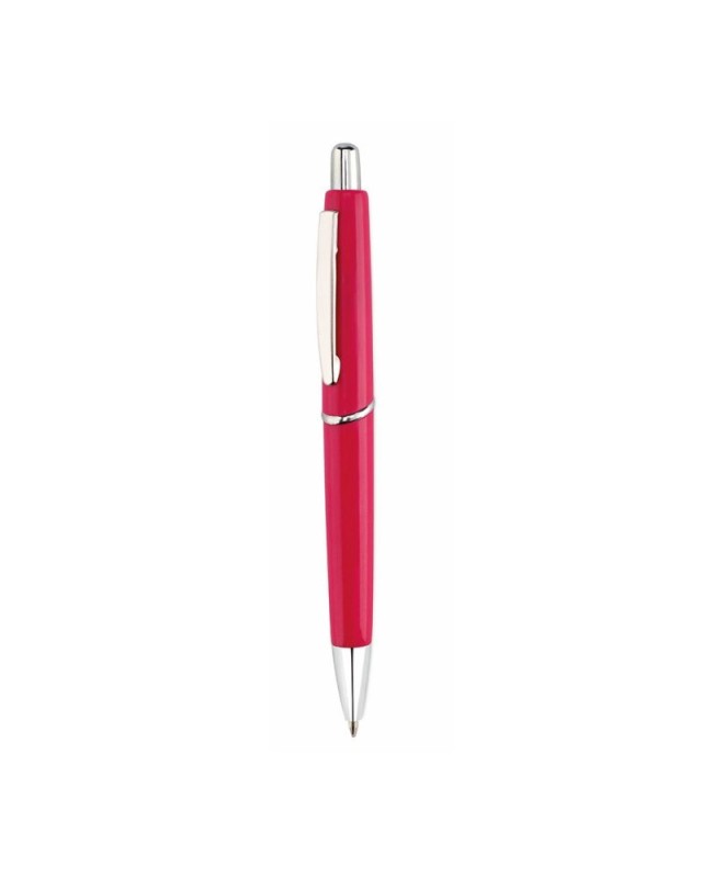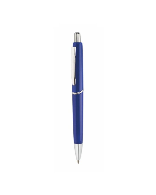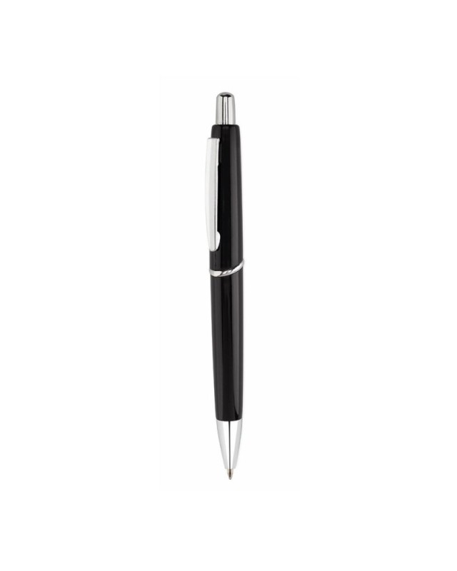 Penna a pulsante dallelegante design bicolore con dettagli in color argento lucido e fusto liscio rifinito in tinta unita di grande effetto. Con clip e anello in metallo coordinati. Refill blu. - Diametro: 1.2 cm - Peso: 8 gr