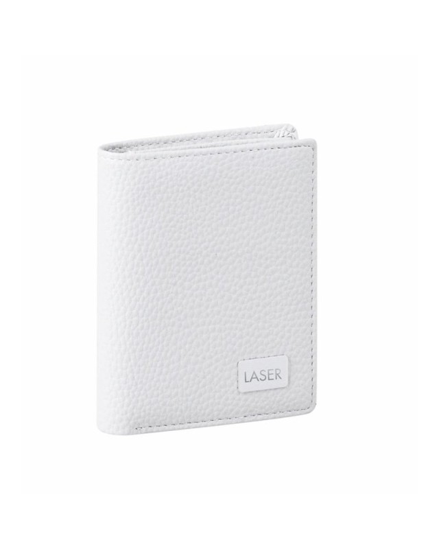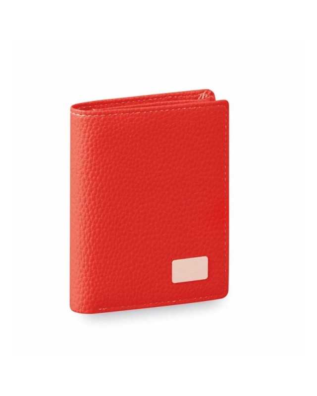 Portafoglio con corpo in morbida ed elegante similpelle lucida in vari colori. Interno con portamonete, scomparto trasparente per i documenti e 4 scomparti per le carte. Con placca metallica esterna per la stampa laser. - Lunghezza: 8.5 cm - Larghezza: 2 cm - Peso: 35 gr