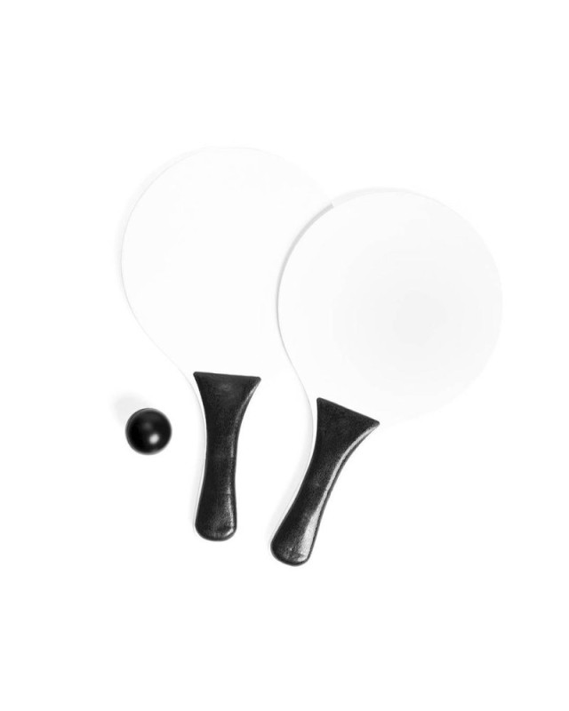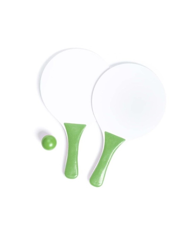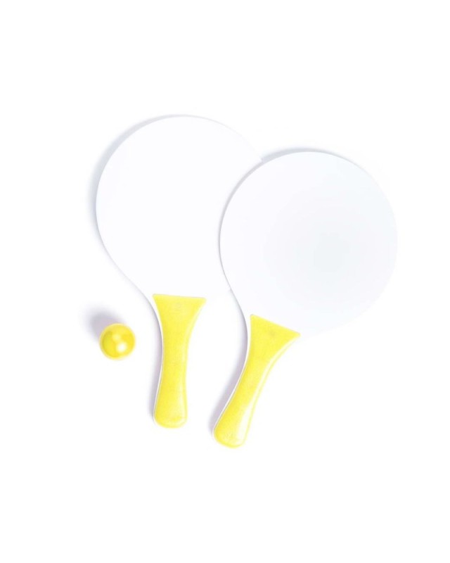 Coppia di racchette da spiaggia in legno naturale con manico rinforzato in unampia gamma di colori vivaci. Presentate in una borsa a rete con pallone abbinato. - Lunghezza: 19 cm - Larghezza: 0.6 cm - Peso: 330 gr