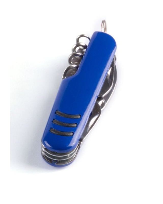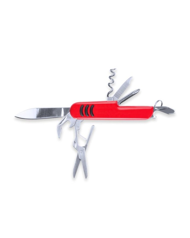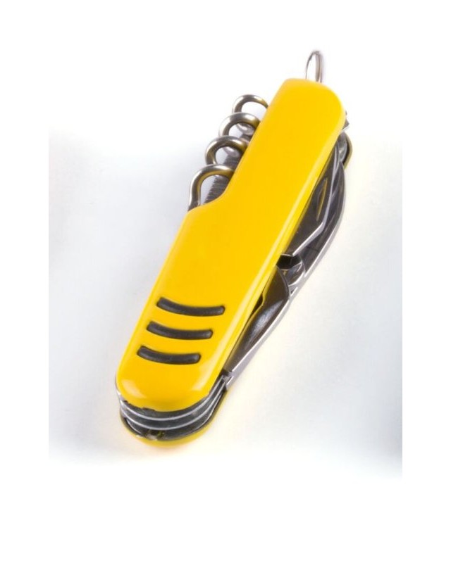 Coltellino multiuso con accessori in acciaio inox con 9 funzioni e manico con inserto antiscivolo in colori vivaci. Presentato in scatola individuale. - Lunghezza: 7.3 cm - Larghezza: 1.3 cm - Peso: 53 gr