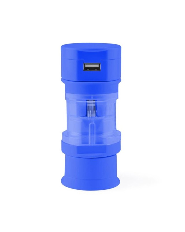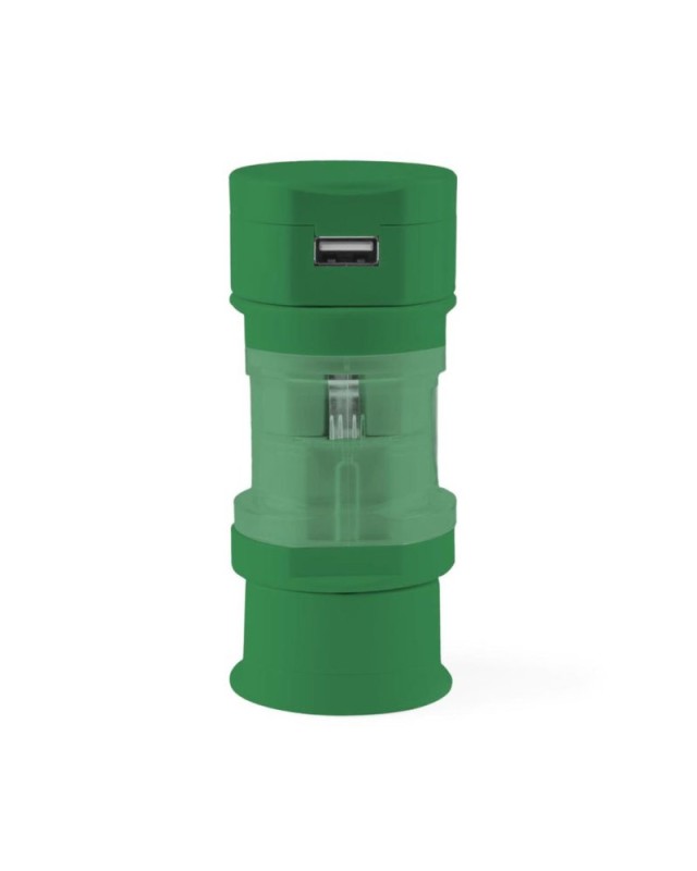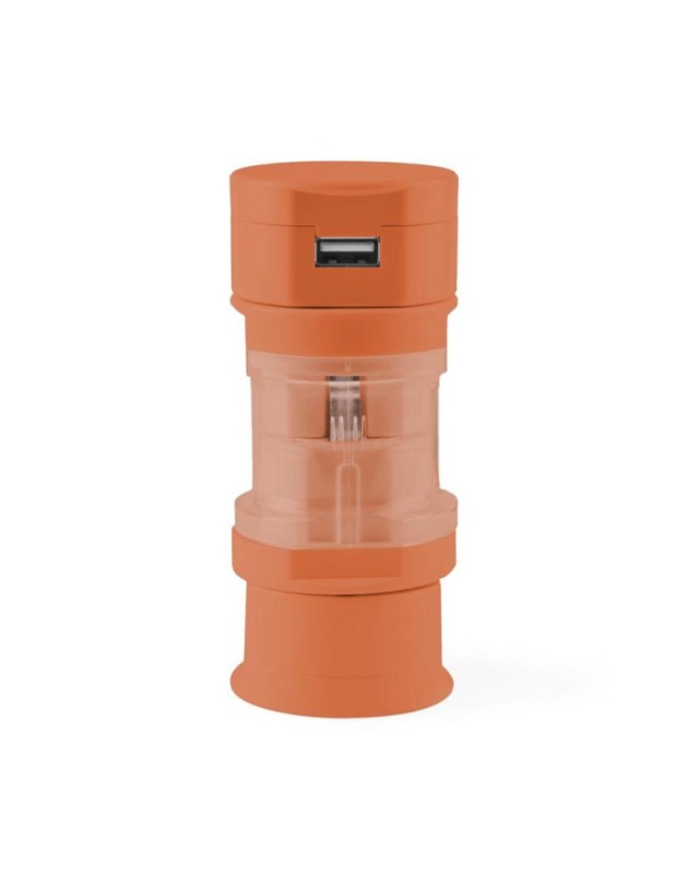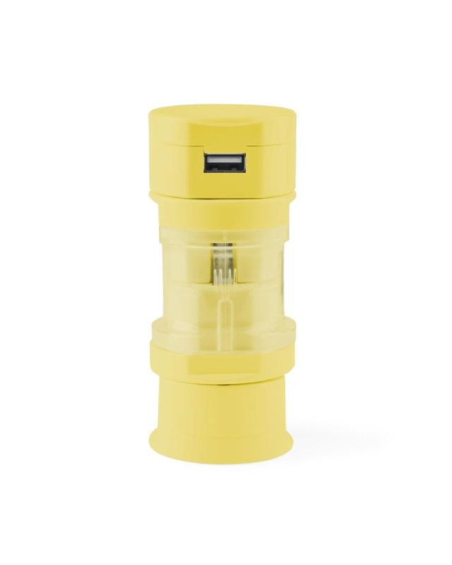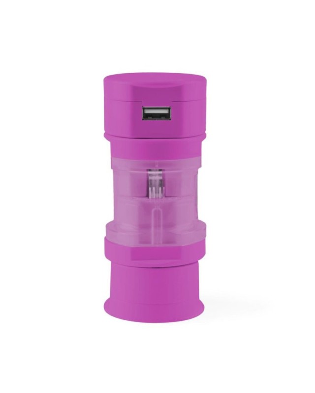 Adattatore di presa con uscita USB dal design compatto e portatile, con capacità di ricarica di 1.000 mA e in una gamma di colori vivaci. Particolarmente indicato per chi viaggia, include adattatori multi-regione per USA, Europa, Asia e Regno Unito. Confezionata singolarmente. - Diametro: 4.8 cm - Peso: 120 gr