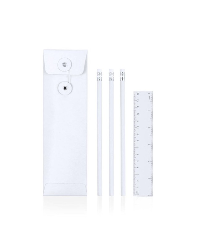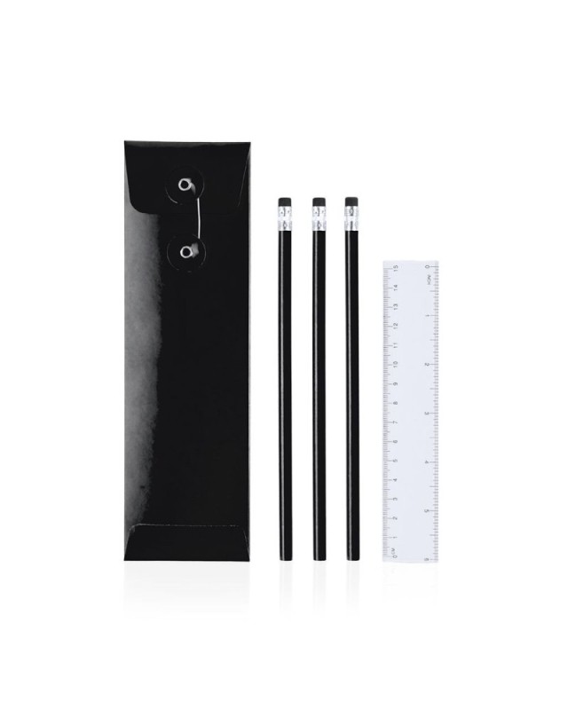 Set di 4 pezzi composto da 3 matite in legno dal corpo arrotondato e dalla finitura lucida in colori vivaci con mina nera e righello trasparente da 15 cm con sistema metrico in centimetri/pollici. Presentato in una scatola di cartone coordinata con chiusura con filo . - Lunghezza: 6.5 cm - Larghezza: 1 cm - Peso: 35 gr