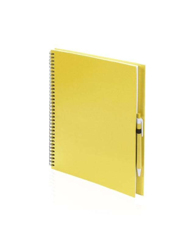 Taccuino ad anelli con copertina soft touch rifinita in robusto cartone riciclato e penna in cartone riciclato abbinata. Colori vivaci, 80 pagine a tinta unita e portapenna sul retro della copertina. - Lunghezza: 23.7 cm - Larghezza: 2 cm - Peso: 520 gr