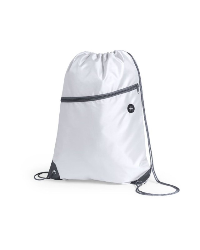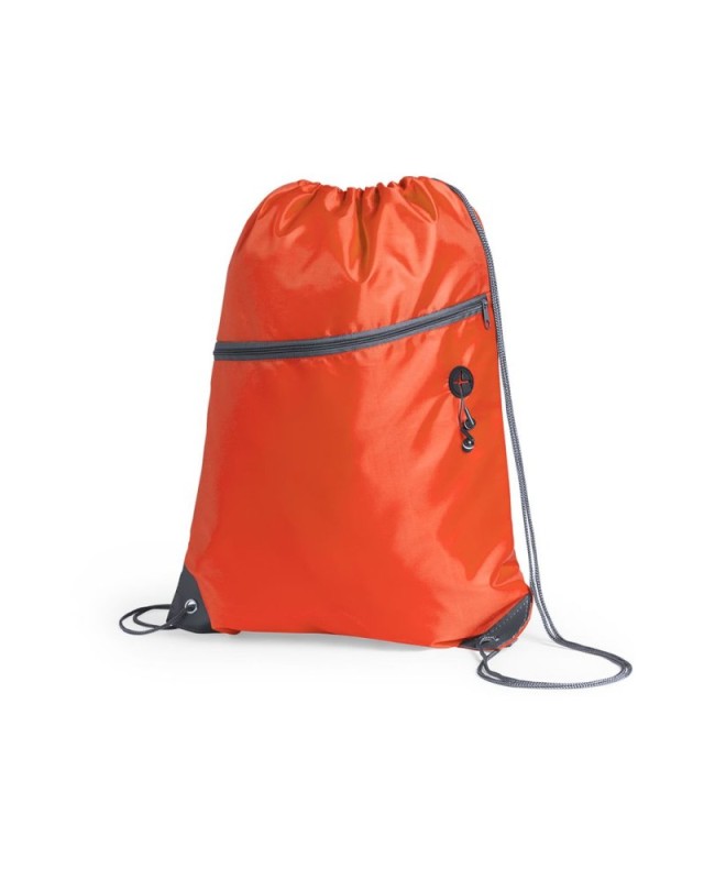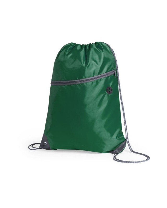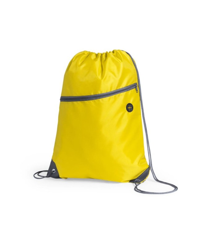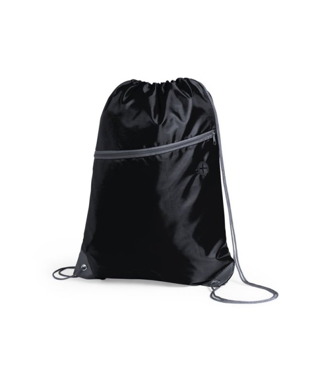 Sacca in morbido poliestere 210D. Con tasca frontale con zip e uscita per le cuffie. Corde autostringenti di colore grigio, cerniera in tinta e angoli con anelli metallici e rinforzo in similpelle. Disponibile in unampia gamma di colori. - Lunghezza: 34.5 cm - Peso: 50 gr