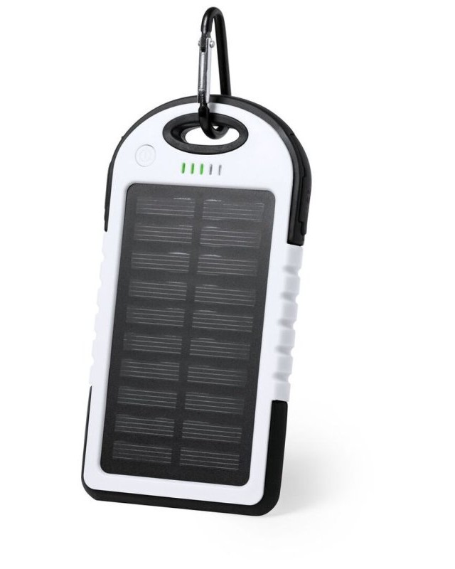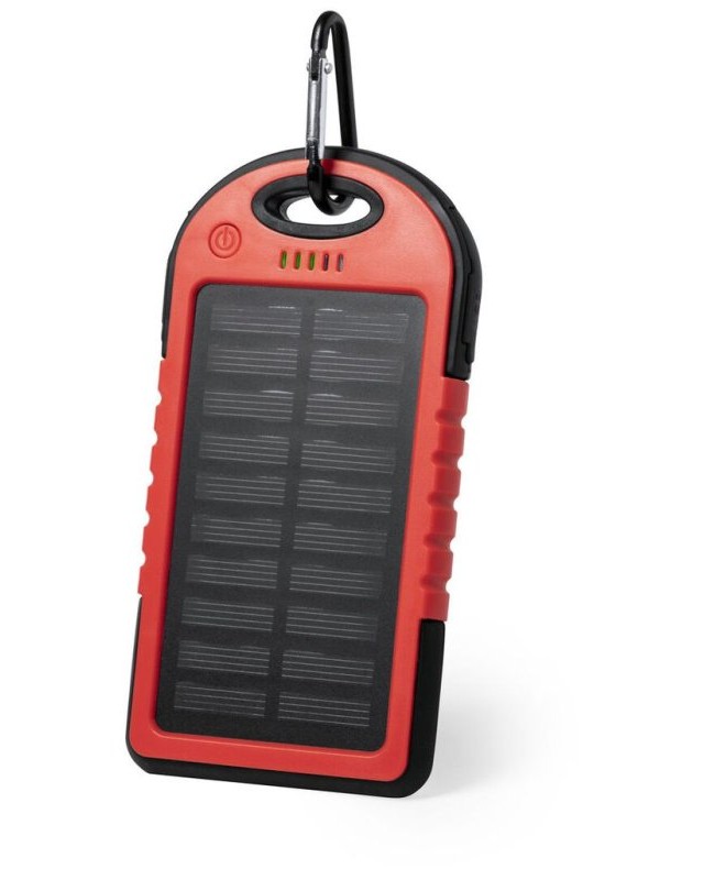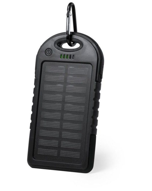 Resistente power bank a ricarica solare ed elevata capacità -4.000mAh-. Taglio sportivo e rivestimento in morbido silicone. Appositamente progettato per le attività allaperto, resistente agli spruzzi dacqua e con moschettone di trasporto in alluminio. Doppia uscita USB per ricaricare due dispositivi contemporaneamente, con indicatori di stato di carica a LED e potente luce a LED con segnalazione SOS da utilizzare in caso di emergenza. Cavo di ricarica micro USB incluso. Disponibile in diversi colori e confezionato singolarmente in unattraente scatola con design. Le capacità indicate su tutti i nostri power bank sono reali e comprendono tutte batterie di grado A e non riciclate, con una durata di almeno 500 cicli di carica e conformi alle normative CE. Inoltre, larticolo è prodotto secondo gli standard RoHS e soddisfa i seguenti requisiti di sicurezza: Sistema di protezione da sovraccarico del dispositivo. Sistema di protezione contro la scarica completa per una maggiore durata.Sistema di blocco per evitare cortocircuiti.Sistema di trasferimento costante della carica, in base alla capacità del dispositivo di destinazione. - Lunghezza: 7.5 cm - Larghezza: 1.5 cm - Peso: 140 gr