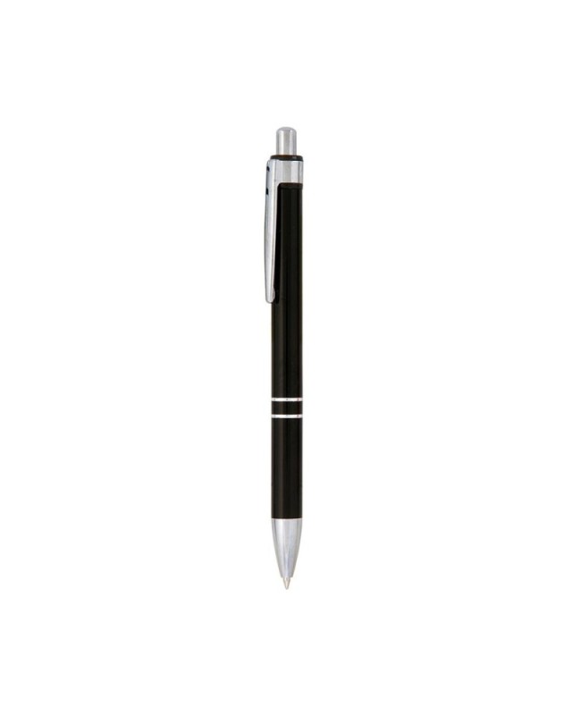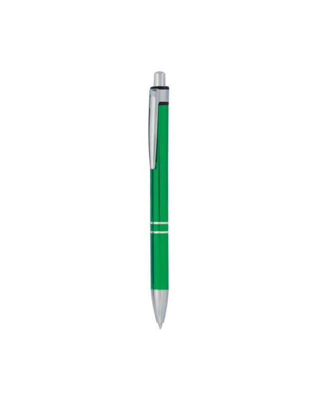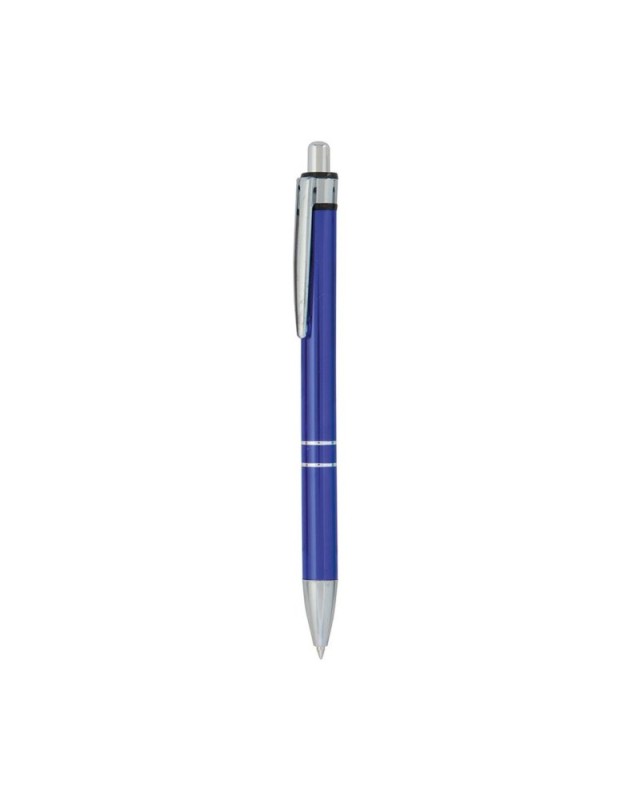 Bolígrafo de mecanismo pulsador en original diseño bicolor. Con cuerpo en aluminio de suave acabado en alegres colores. Accesorios y anillas en plateado. Clip de original diseño y tinta azul. - Diametro: 1 cm - Peso: 14 gr