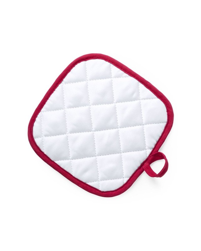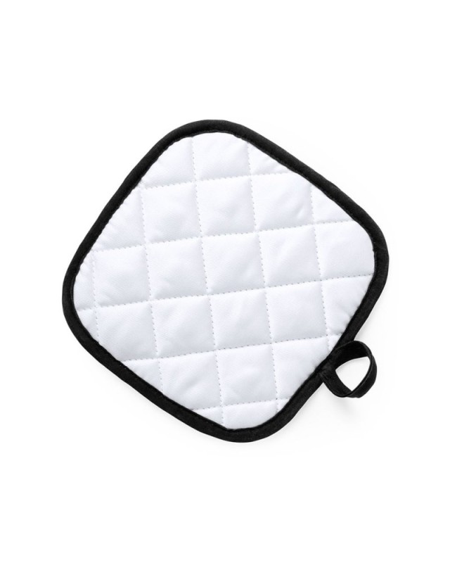 Presina da cucina in morbido materiale 100% poliestere con finitura bianca liscia e bordi dai colori vivaci. Con un lato liscio appositamente studiato per la sublimazione e nastrino per essere appeso. - Lunghezza: 17 cm - Peso: 26 gr