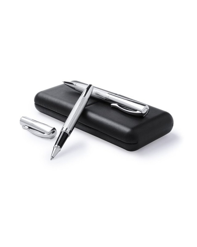 Elegante set di penna con meccanismo a rotazione e roller dal design sobrio. Fusto in metallo antiscivolo con finitura argento lucido e clip abbinata. Presentato in un elegante e originale astuccio individuale in similpelle nera con interno fustellato in morbida pelle scamosciata bianca. Cartuccia Jumbo con inchiostro blu di qualità tedesca. - Diametro: 1.3 cm - Peso: 226 gr
