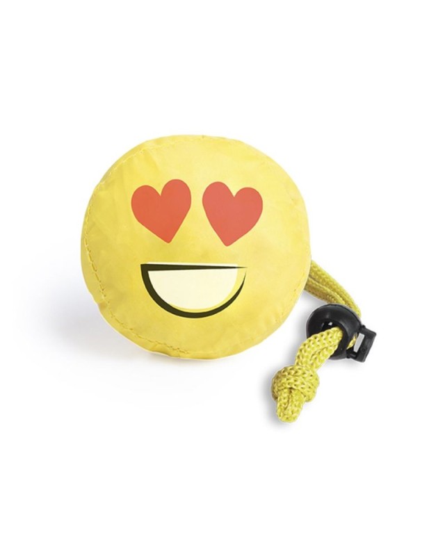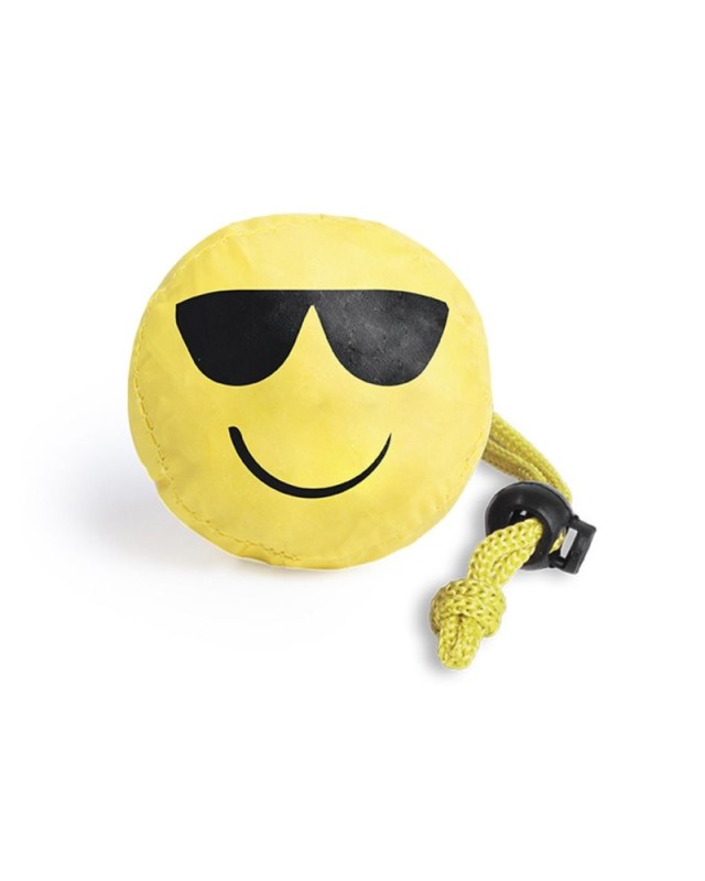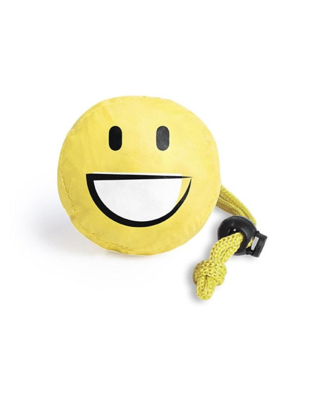 Borsa pieghevole dal divertente design emoji in giallo brillante. Realizzata in morbido poliestere 190T con coulisse e laccetto in tinta. - Lunghezza: 40 cm - Peso: 22 gr