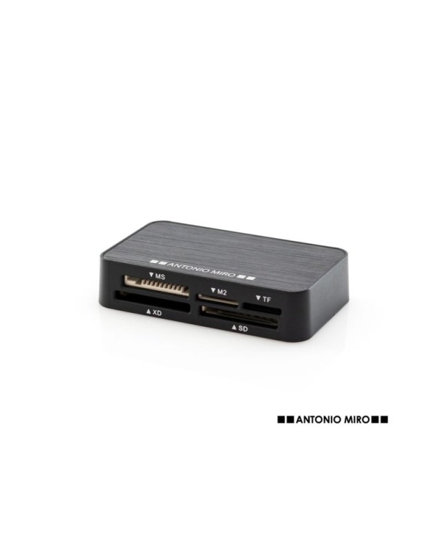 Lector de tarjetas de Antonio Miró con parte superior acabada en aluminio de elegante color negro. Compatible con tarjetas MS, M2, TF, XD, SD y CF. Presentado en caja individual con logotipo de la marca e interior troquelado en suave espuma. - Lunghezza: 7.2 cm - Larghezza: 4.2 cm - Peso: 60 gr