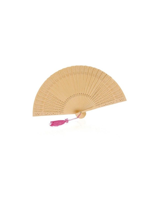 Ventaglio realizzato con stecche di legno naturale fustellate. Con cinghia di trasporto con pompon e presentato singolarmente in una scatola. - Lunghezza: 35 cm - Peso: 34 gr