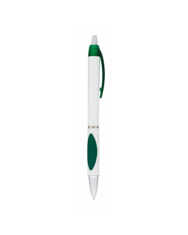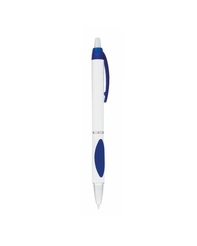 Bolígrafo de mecanismo pulsador de atrevido diseño bicolor con accesorios en colores translúcidos y cuerpo de suave acabado en color blanco sólido. Con original clip a juego. Tinta azul. - Diametro: 1 cm - Peso: 8 gr