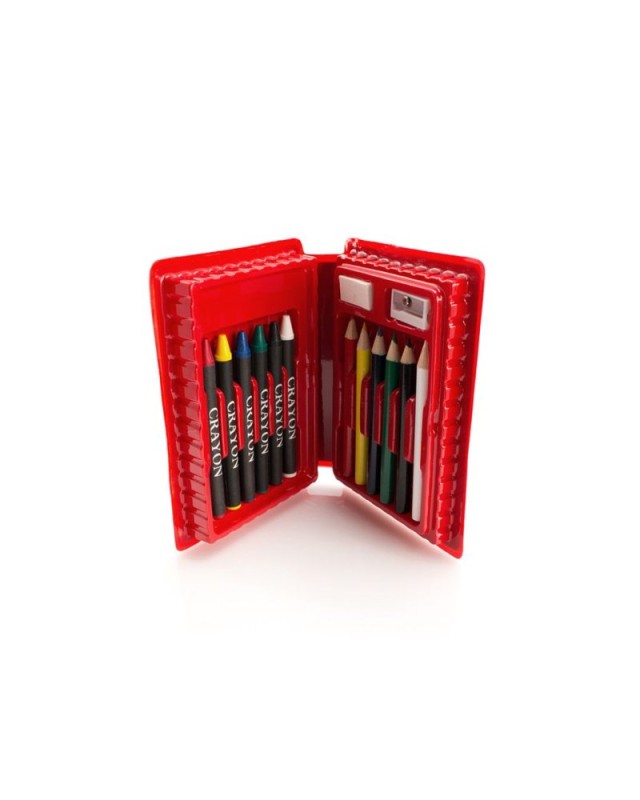 Set composto da 14 pezzi in un robusto astuccio in colori vivaci e interno con scomparti di sicurezza. Contiene gomme, temperamatite, pastelli e matite di legno con corpo cilindrico in diversi colori. - Lunghezza: 9.6 cm - Larghezza: 2.5 cm - Peso: 78 gr