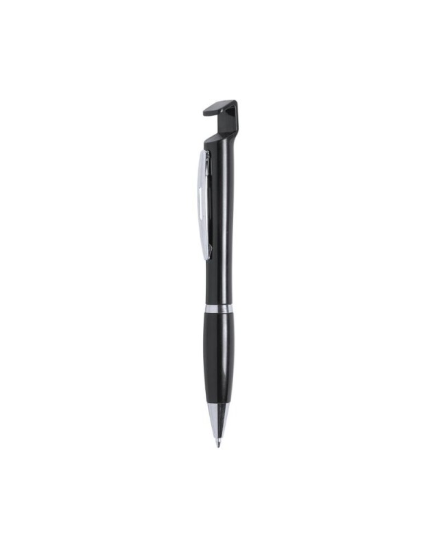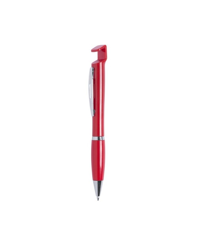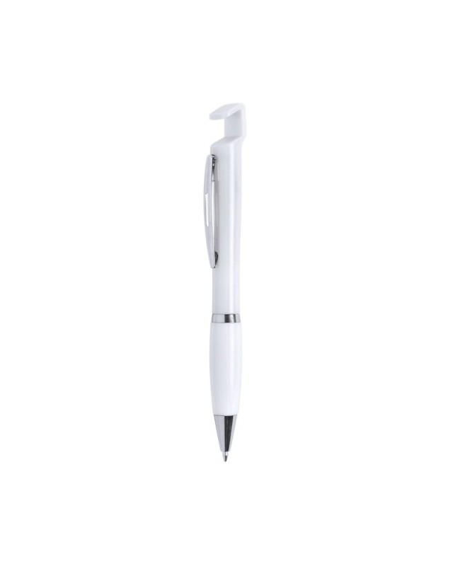 Penna con supporto per dispositivi mobili. Meccanismo a pulsante e dal design bicolore con finiture argentate e fusto liscio con divertenti colori a tinta unita. Con clip originale in metallo sagomato e impugnatura confortevole. Inchiostro blu. - Diametro: 1.3 cm - Peso: 10 gr