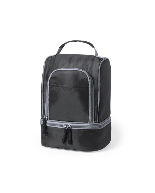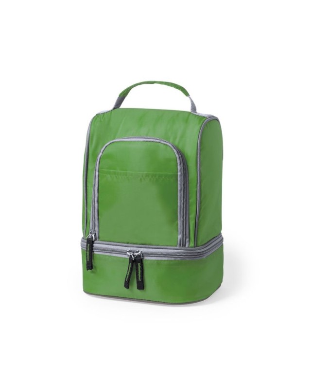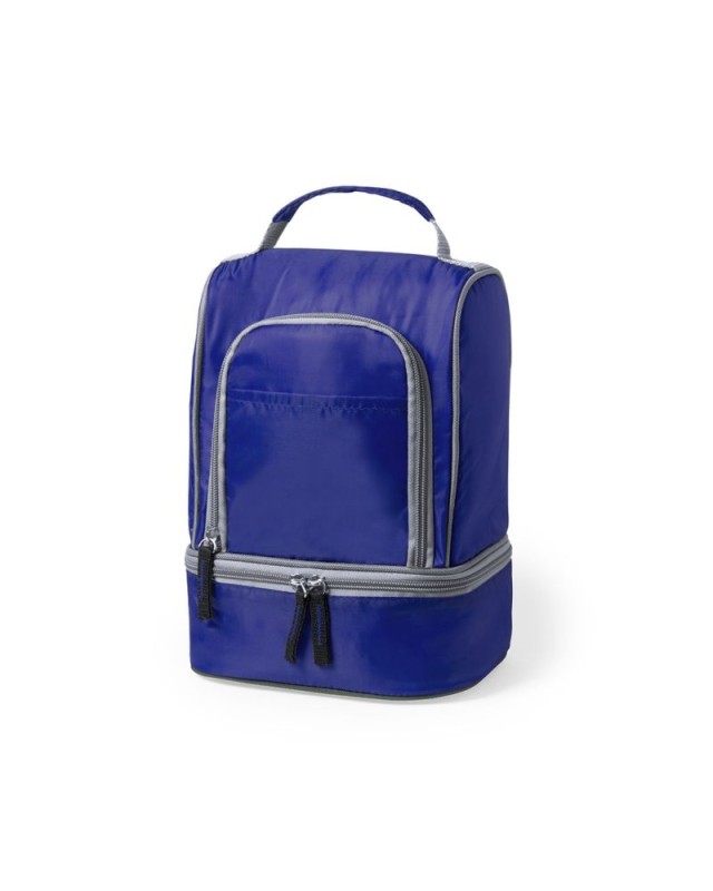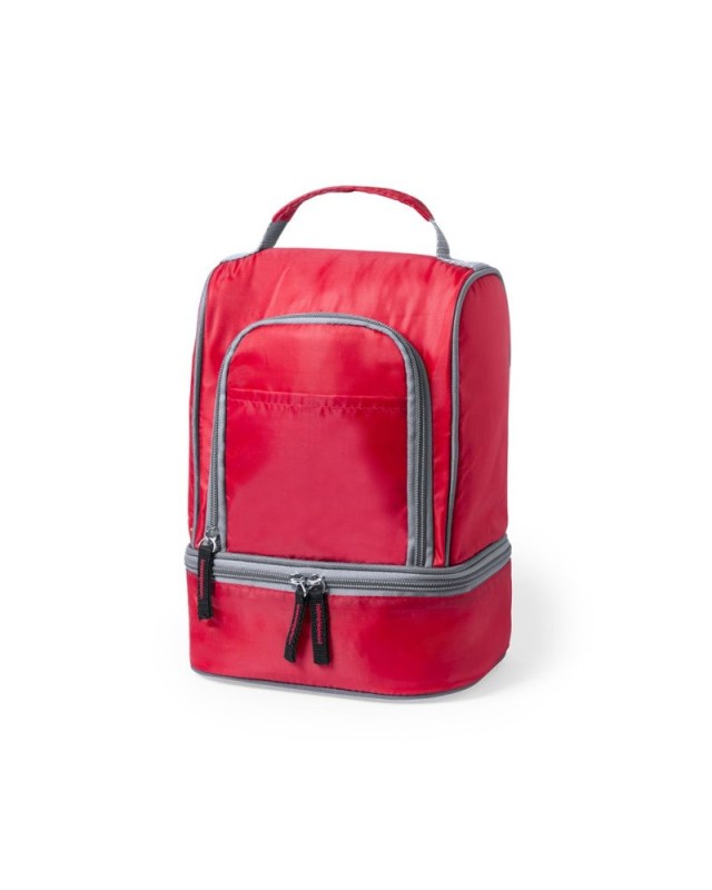 Borsa termica all-terrain in poliestere 210D dai colori vivaci con due scomparti separati con cerniera. Con tasca frontale, di cui una con zip, e interno isotermico in PEVA. Pratica maniglia di trasporto rinforzata in tinta. - Lunghezza: 20 cm - Larghezza: 13 cm - Peso: 135 gr
