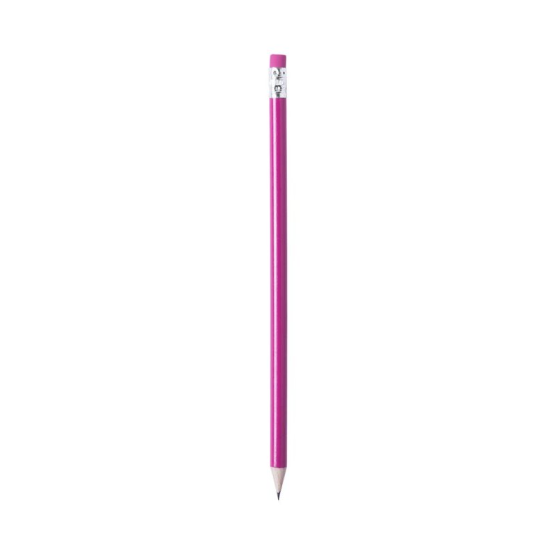Matita in legno con finitura lucida. Corpo rotondo e gomma dal colore abbinato. Disponibile in vari colori. Mina nera e punta affilata. - Diametro: 0.7 cm - Peso: 5.6 gr