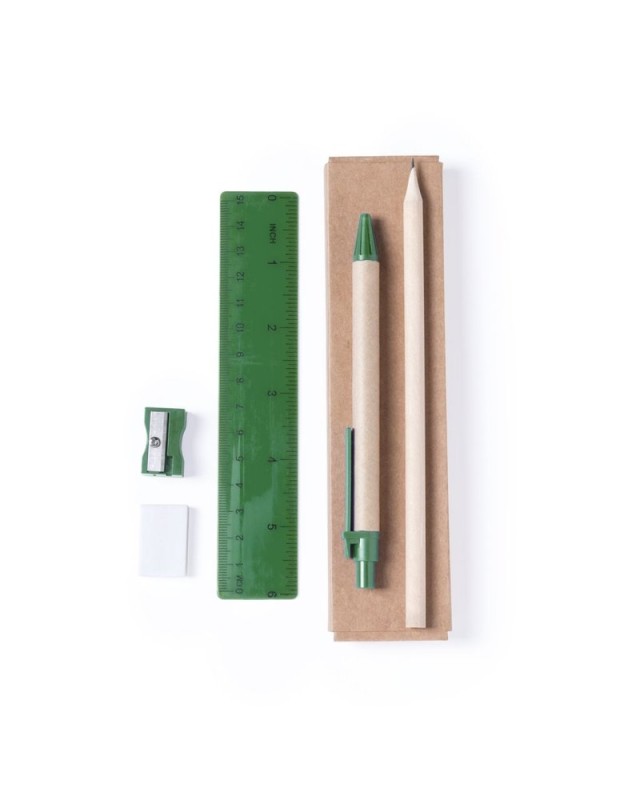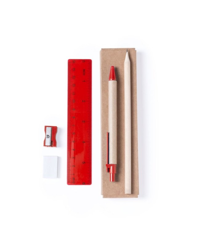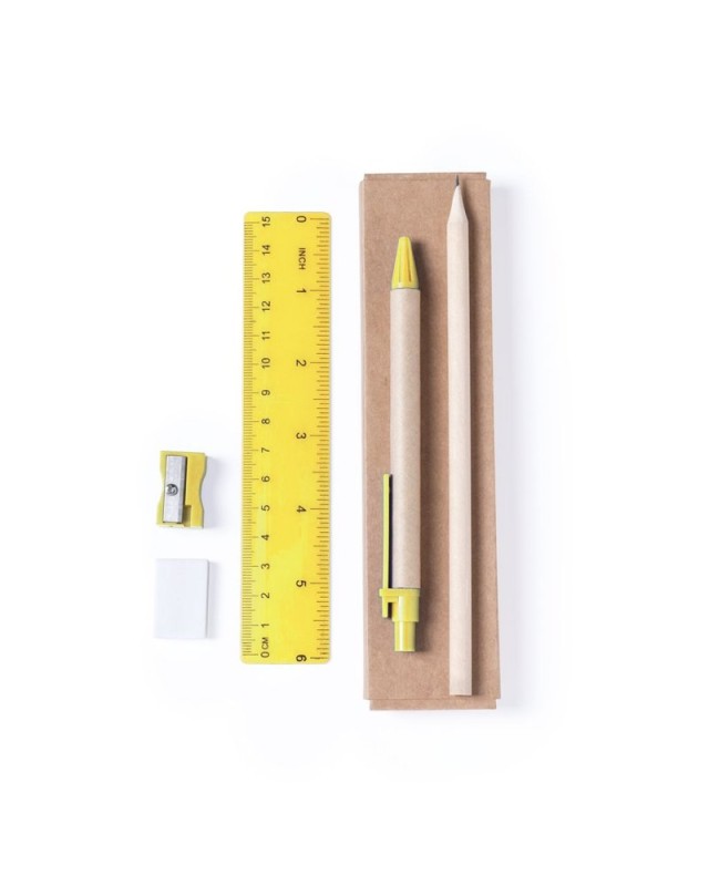 Set da 5 pezzi in una varietà di colori vivaci presentati in una scatola di cartone naturale. Include penna con meccanismo a pulsante e inchiostro blu in cartone riciclato, matita cilindrica in legno, temperamatite, gomma e righello da 15 cm. - Lunghezza: 4.5 cm - Larghezza: 1.5 cm - Peso: 33 gr