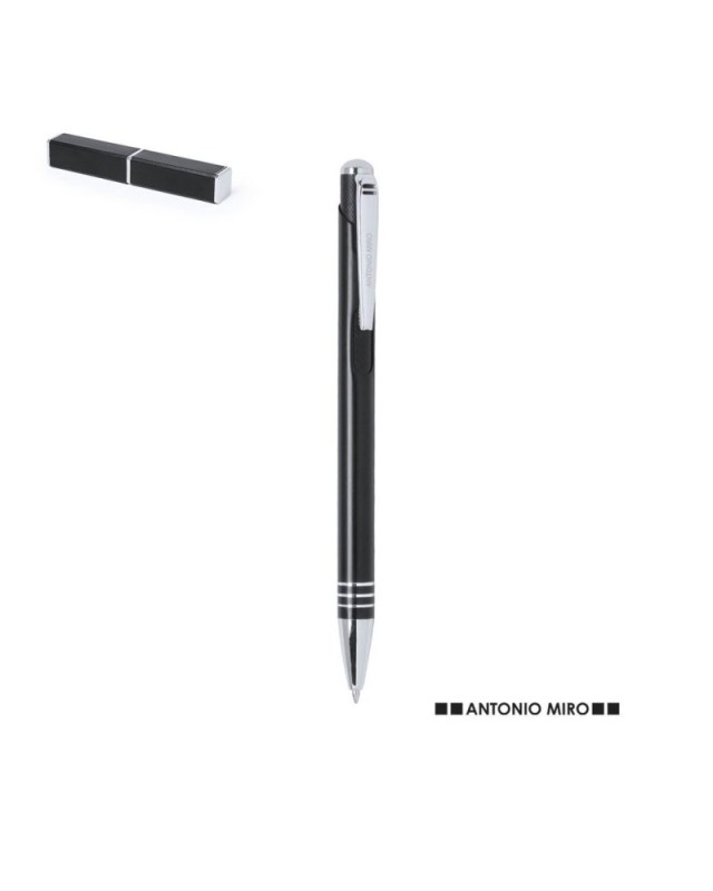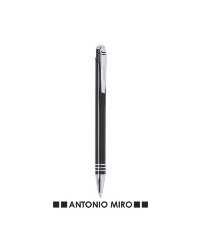 Penna by Antonio Miró dallelegante design e dal fusto in alluminio liscio con dettagli color argento. Meccanismo a pulsante, con parte superiore e motiv onel fusto in trama di carbonio. Originale clip in metallo e presentata in una custodia individuale in alluminio nero con logo del marchio. Inchiostro blu. - Diametro: 1 cm - Peso: 15 gr
