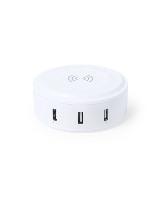 Caricatore wireless circolare con capacità di ricarica di 3.100 mAh. Corpo con elegante finitura bianca. Con superficie e base antiscivolo e indicatore di stato di carica a LED. Include 3 uscite USB: 2x2,1A e 1x1A. Compatibile con i dispositivi dotati di tecnologia di ricarica wireless e presentato in una scatola dal design accattivante. - Diametro: 9.4 cm - Peso: 186 gr