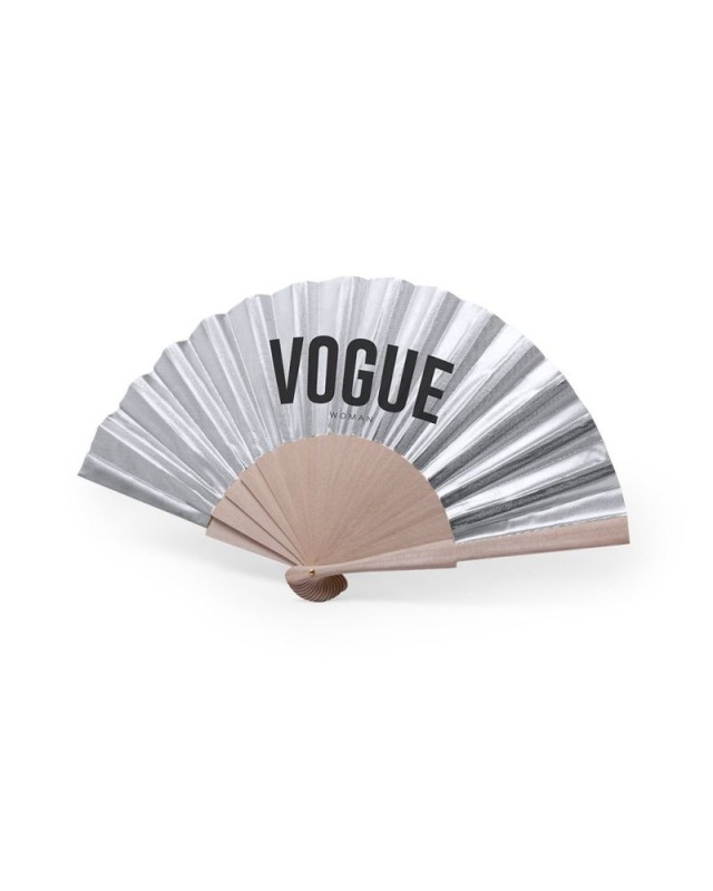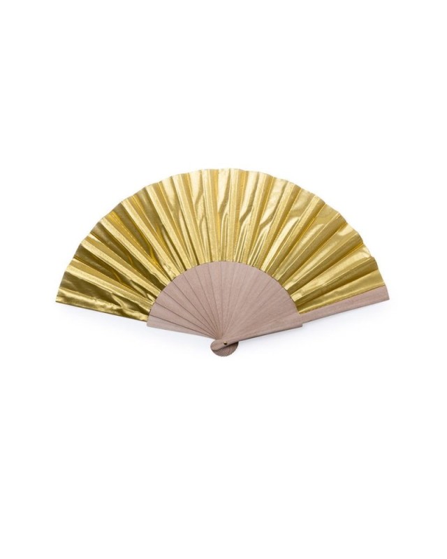 Abanico de varillas de madera natural y tela en poliéster de acabado brillo. Disponible en colores dorado y plateado. Presentado en caja individual. - Lunghezza: 42 cm - Peso: 40 gr